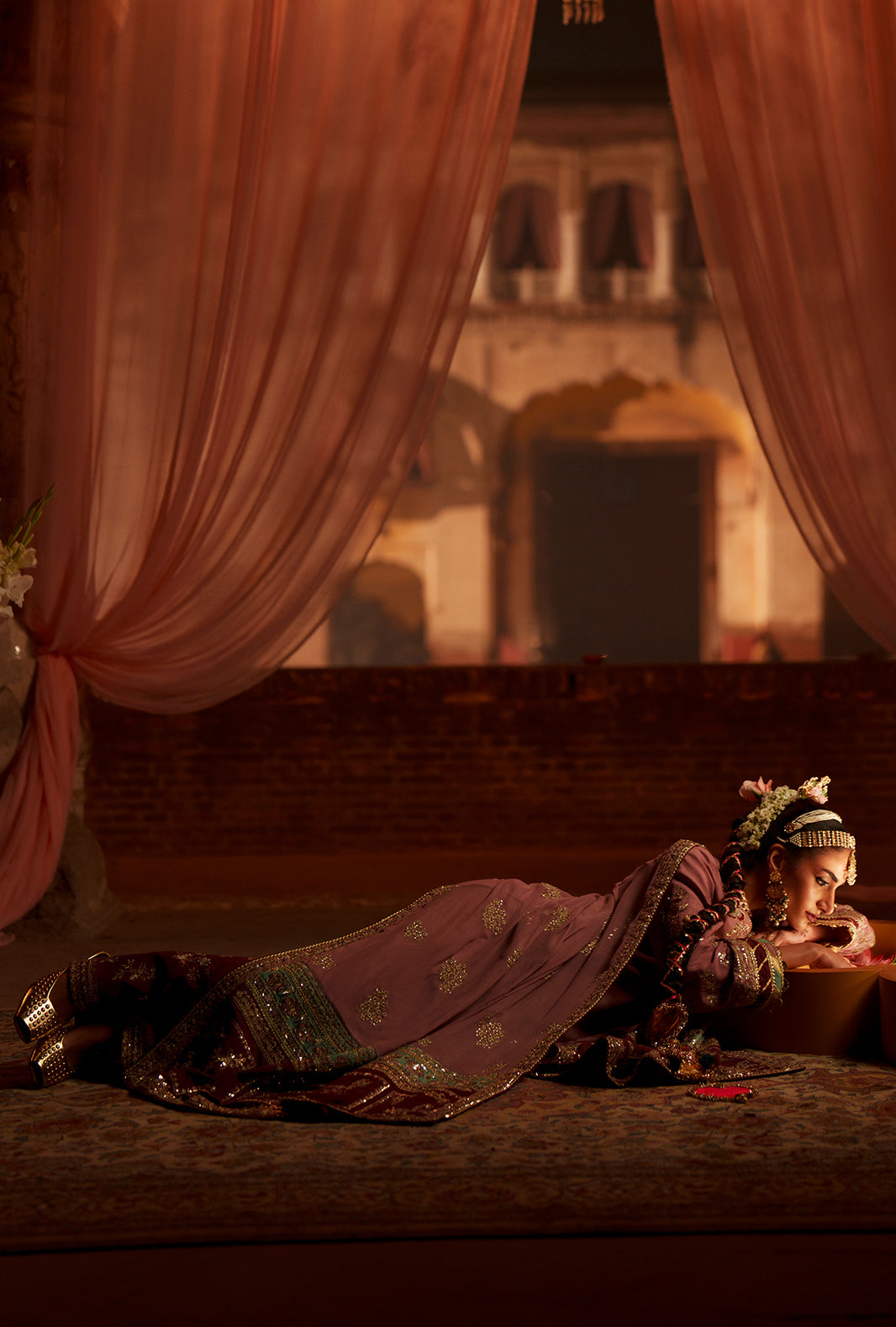 Tea-pink rawsilk kameez adorned with intricate daman embroidery and a refined neckline, sleeves edged with magenta-accented borders. The ombre farshi shalwar offers versatile styling, while the embroidered chiffon dupatta, with its dual-colored pallus in ferozi and magenta, completes a look of timeless elegance and flowing charm.