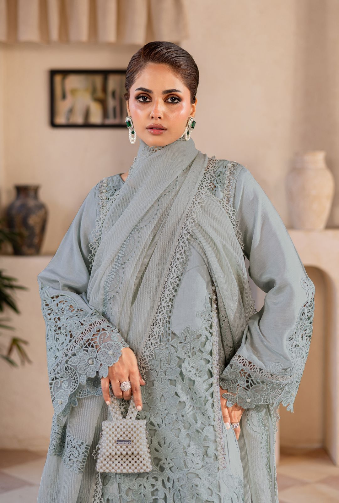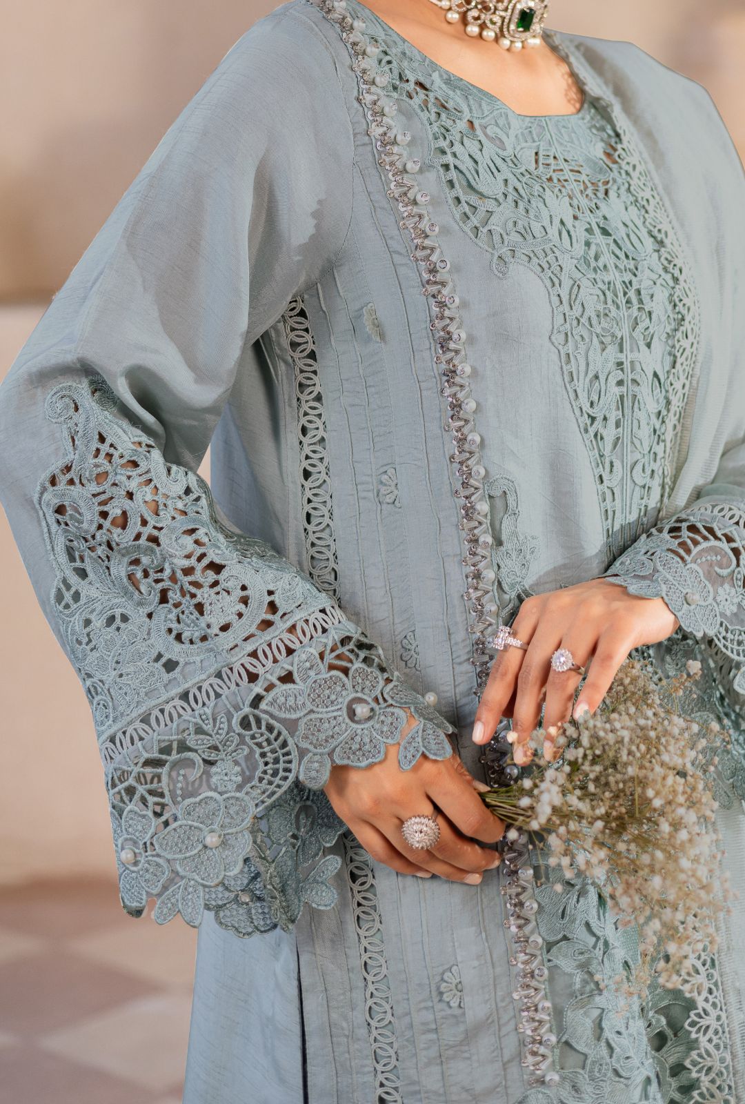 This exquisite pale ferozi ensemble showcases a long shirt adorned with intricate cutwork embroidery along the neckline, central panel, and side panels. The look is elevated by embellished plackets featuring pearls, crystals, and Swarovski accents. Paired with loose pants that have embroidered details, the outfit is beautifully completed with a cotton net dupatta, delicately finished with lace.