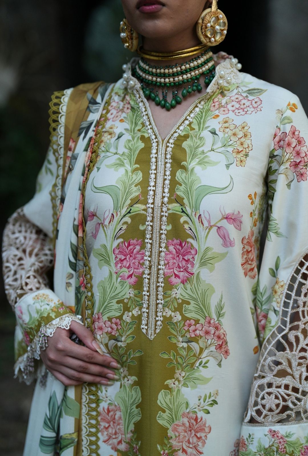 A digitally printed shirt paired with a matching printed trouser, designed to capture effortless sophistication in every thread. The look is elevated with an embroidered organza neckline patti, delicate sleeves border, and an intricately embroidered daman border — a true celebration of detail and artistry. Wrapped in a woolen printed shawl, Gulrukh blooms with elegance, warmth, and timeless allure.