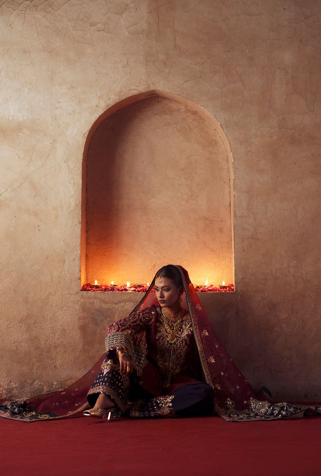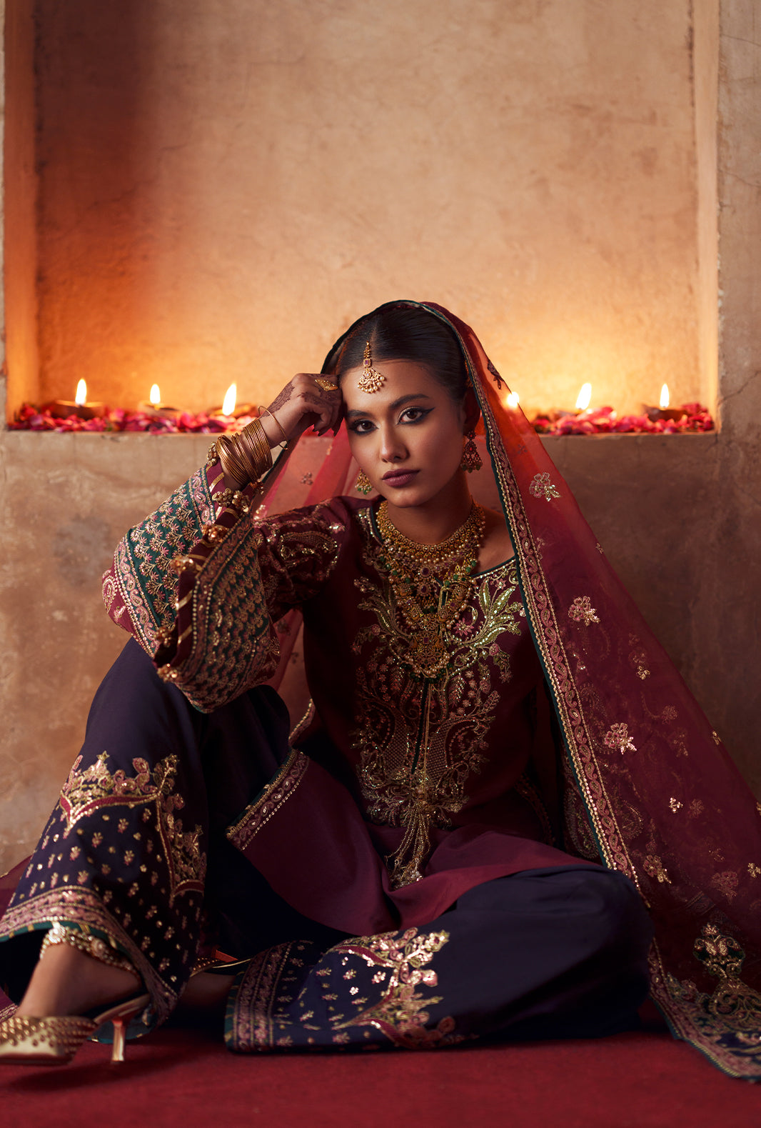 Statement embroidered neckline on dyed rawsilk, side pattis, and intricately detailed sleeves with floral jall and paisley motifs. Indigo rawsilk shalwar echoes elegance with embroidered borders, while the organza dupatta with indigo and teal pallus, and embroidered four-sided trims, completes a look of refined artistry and festive grace.