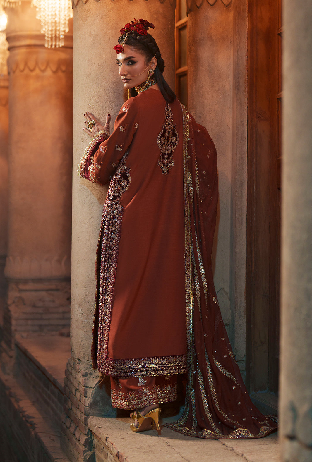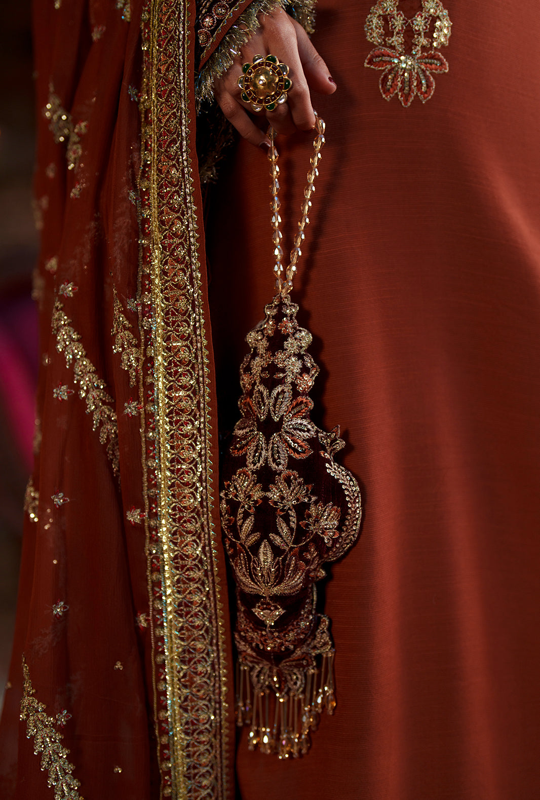 Embroidered keyhole neckline, daman motifs, and velvet-bordered side slits bring bold elegance to the rawsilk kameez. Sleeves and trousers mirror the richness with composed embroidery and chan work, while a chiffon dupatta, finished with a four-sided embroidered border, completes a look made to move gracefully and linger beautifully.