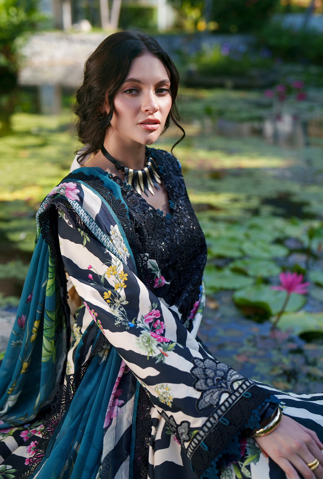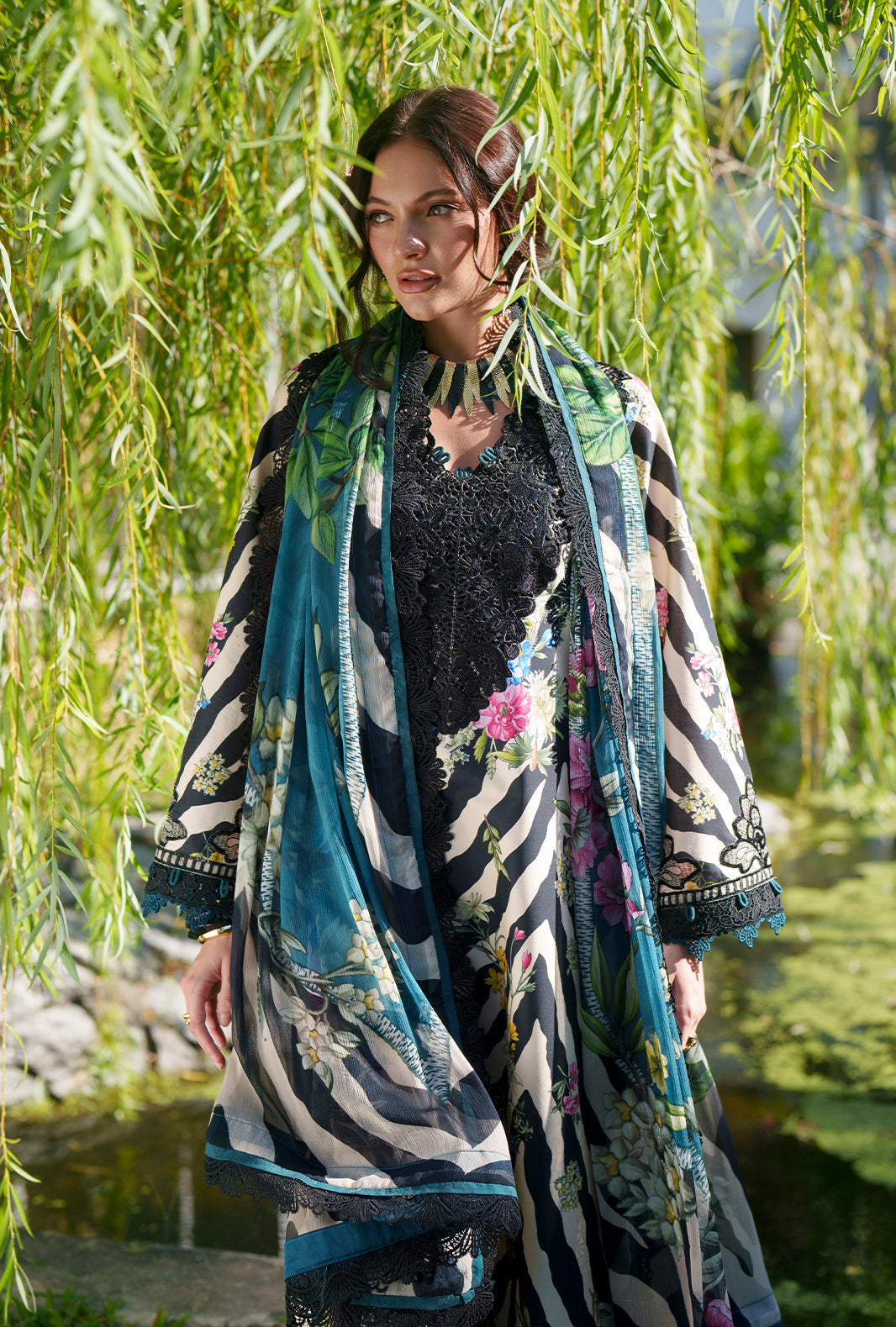 IRIS features a beautifully printed lawn shirt enhanced with an embroidered front neckline and shirt front border, bringing elegance to the forefront. Embroidered sleeve borders add a delicate touch, while printed lawn sleeves and back maintain a cohesive charm. Paired with printed cotton trousers and a soft chiffon printed dupatta, this ensemble radiates graceful sophistication.
