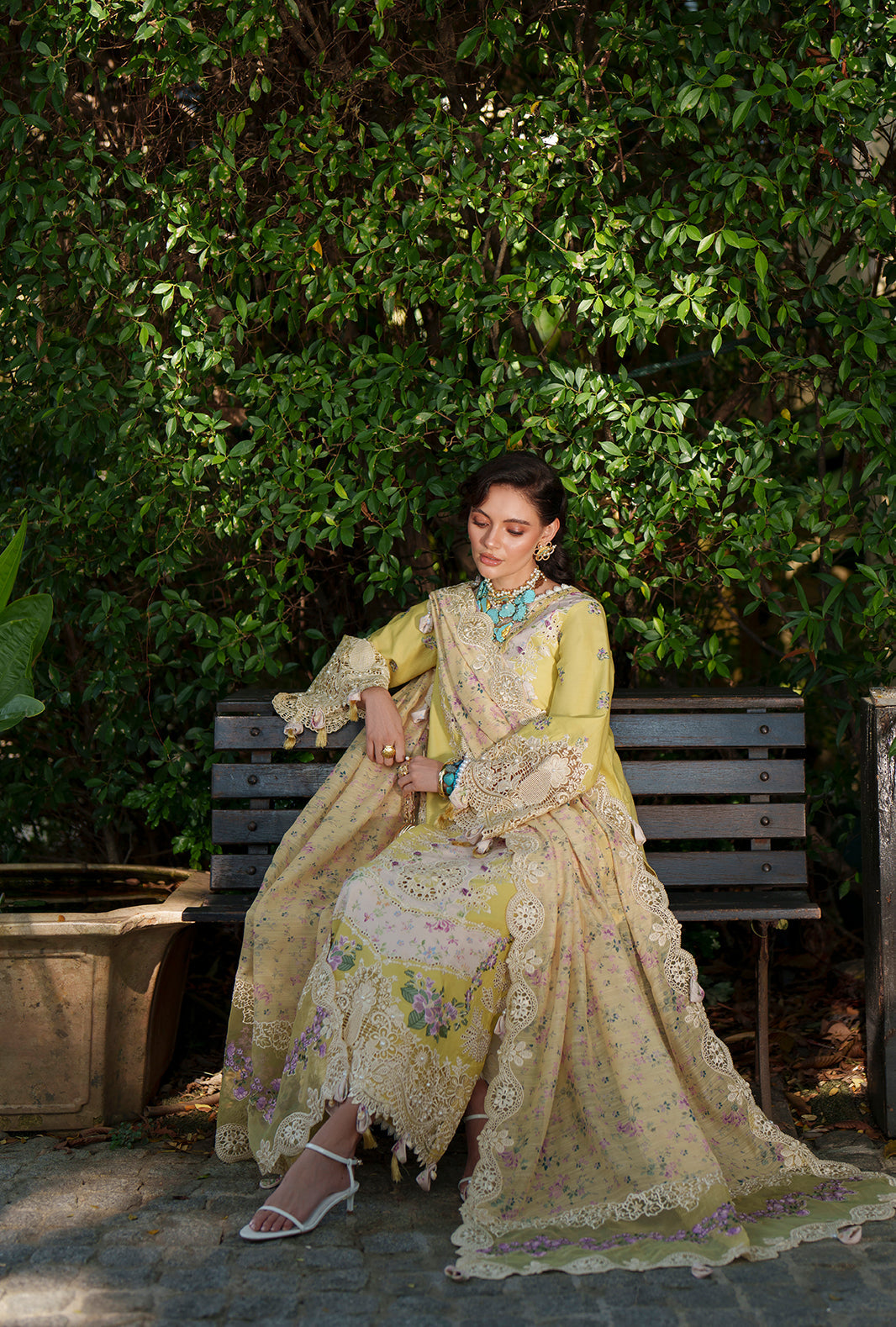 Paired with an elegantly embroidered monark dupatta and classic cambric trousers, this ensemble embodies timeless charm and effortless sophistication.