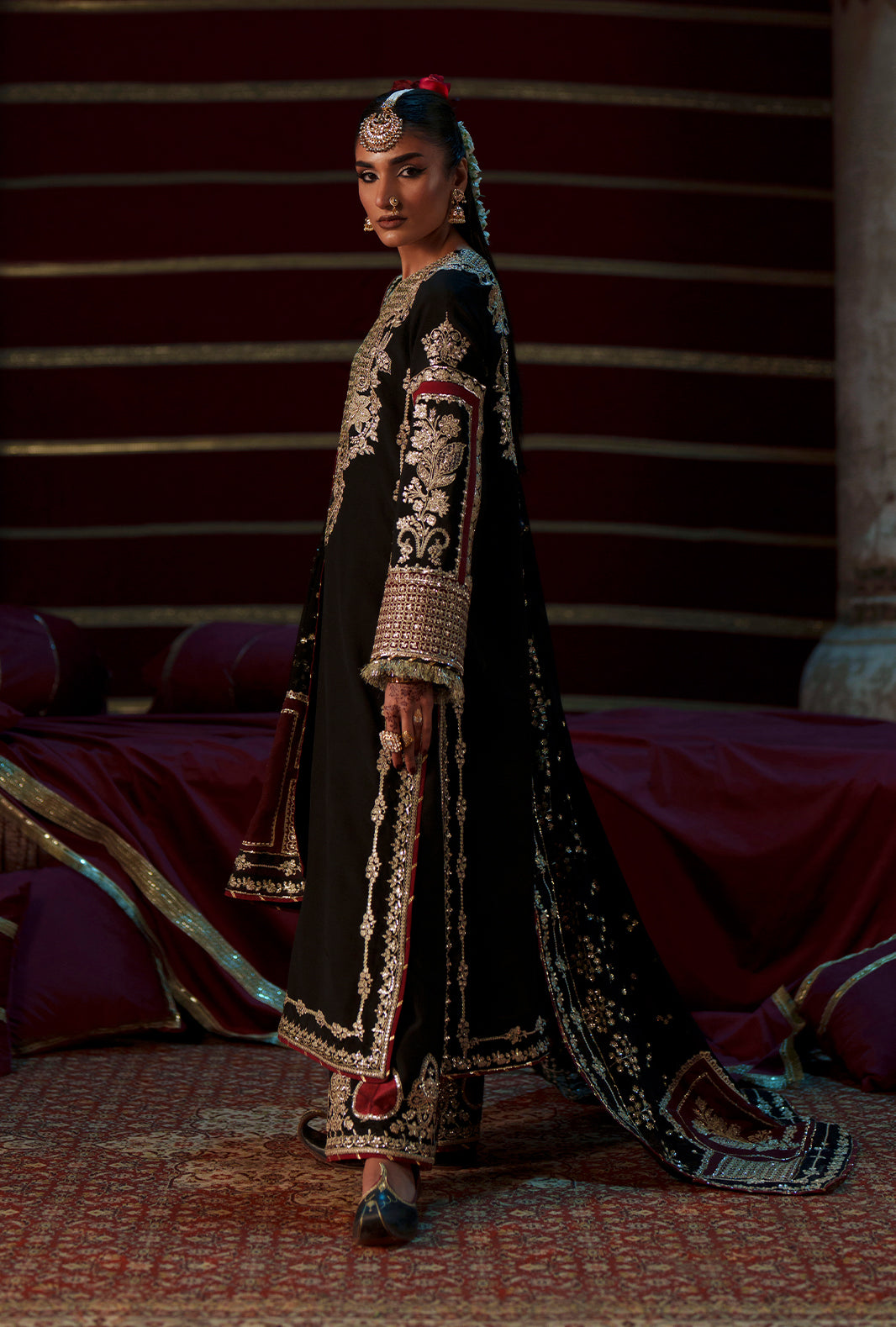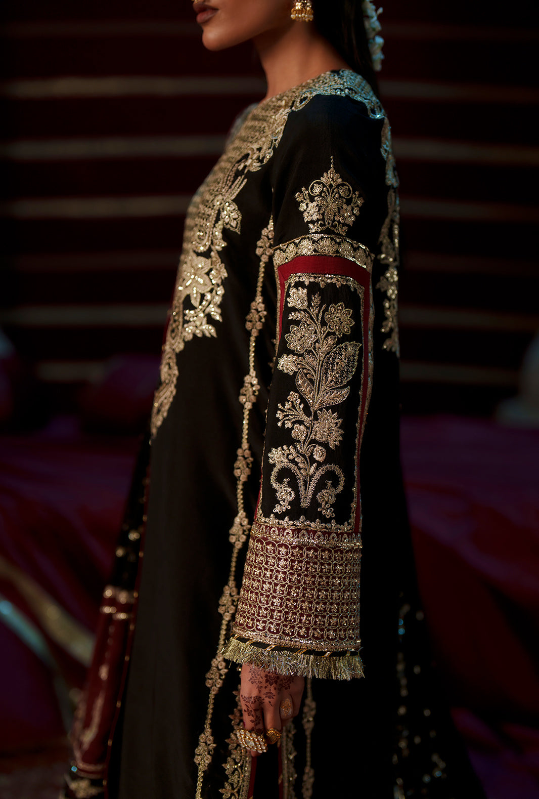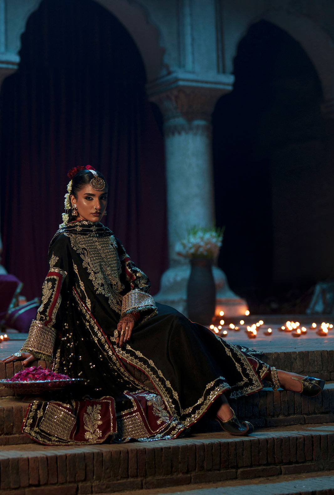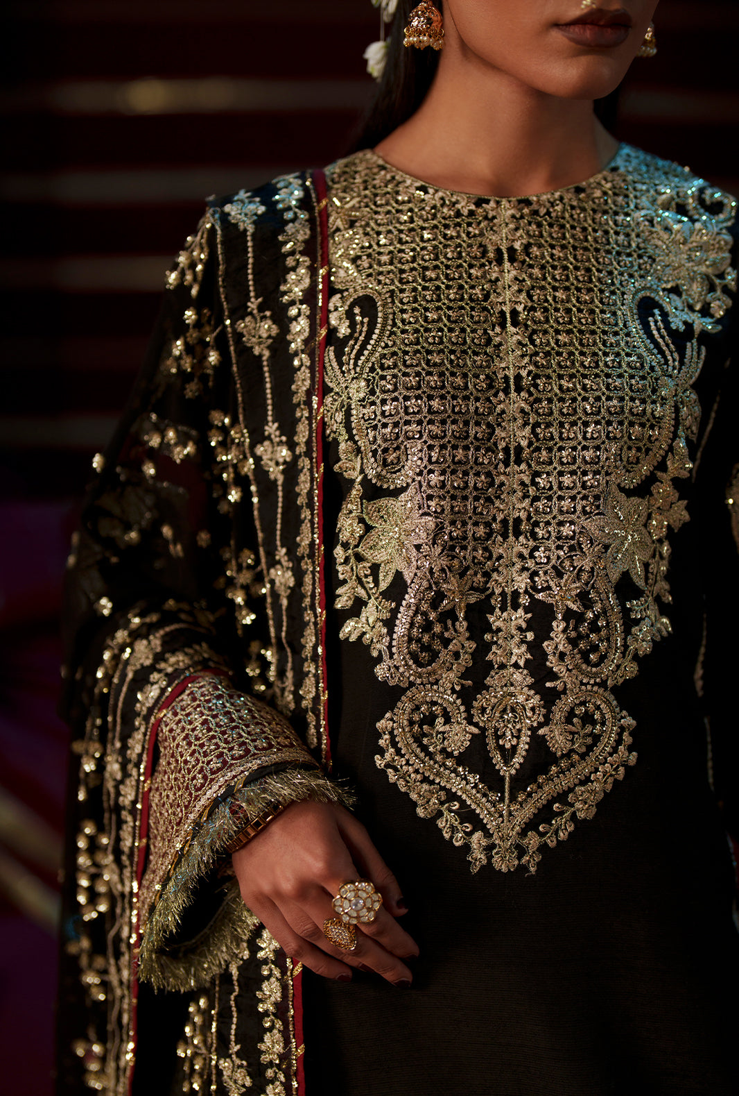 In black rawsilk, the kameez stands tall with a statement neckline, embroidered daman, and intricate sides. Maroon borders and floral-geometric motifs trace the sleeves, while the appliqued trouser echoes its charm. Draped with a chiffon dupatta kissed by sequins, its maroon pallu and embroidered edges sway like poetry in motion, turning every moment into a celebration of artistry and timeless beauty.