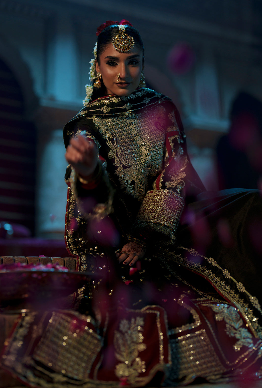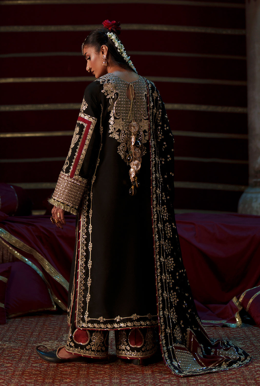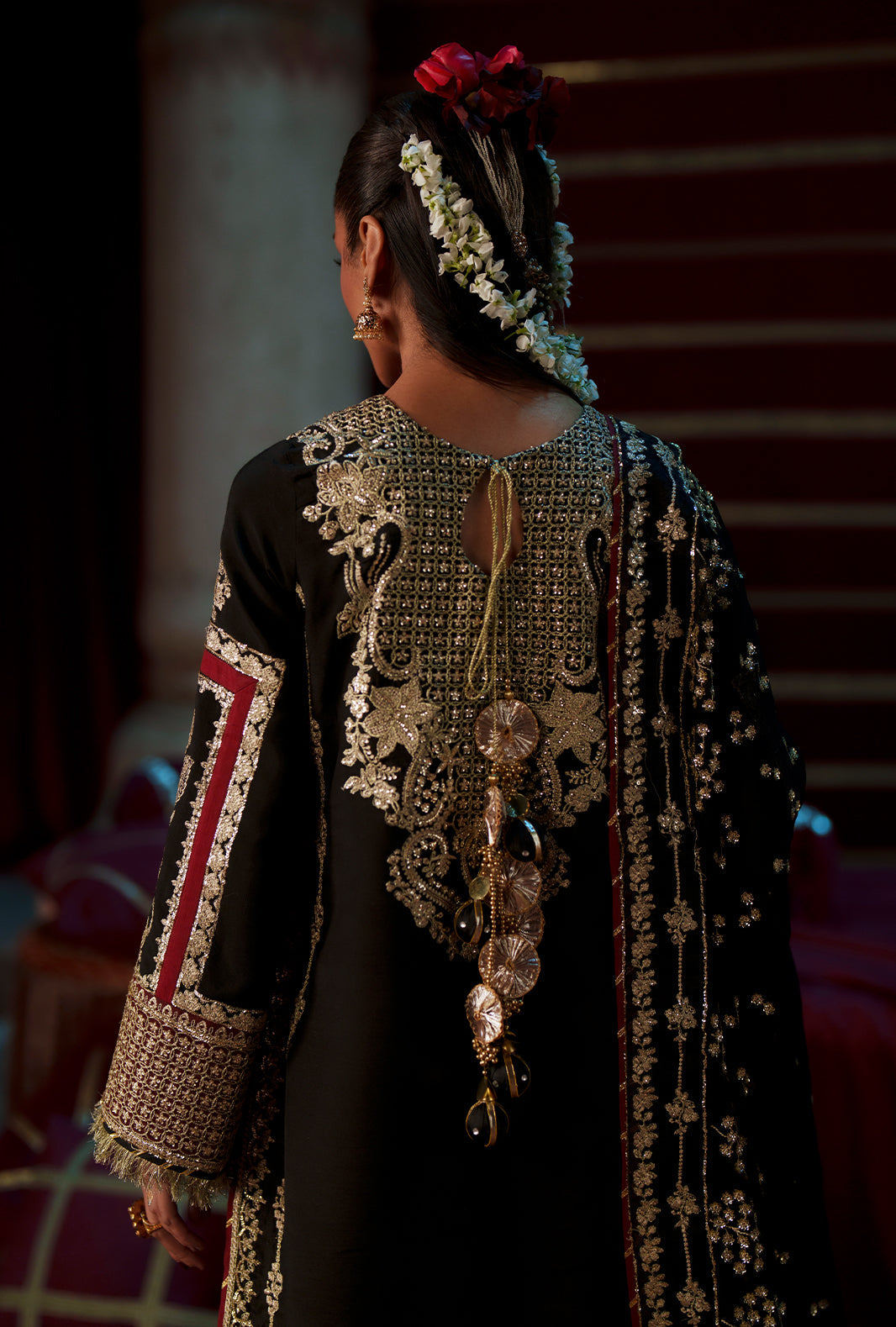 In black rawsilk, the kameez stands tall with a statement neckline, embroidered daman, and intricate sides. Maroon borders and floral-geometric motifs trace the sleeves, while the appliqued trouser echoes its charm. Draped with a chiffon dupatta kissed by sequins, its maroon pallu and embroidered edges sway like poetry in motion, turning every moment into a celebration of artistry and timeless beauty.