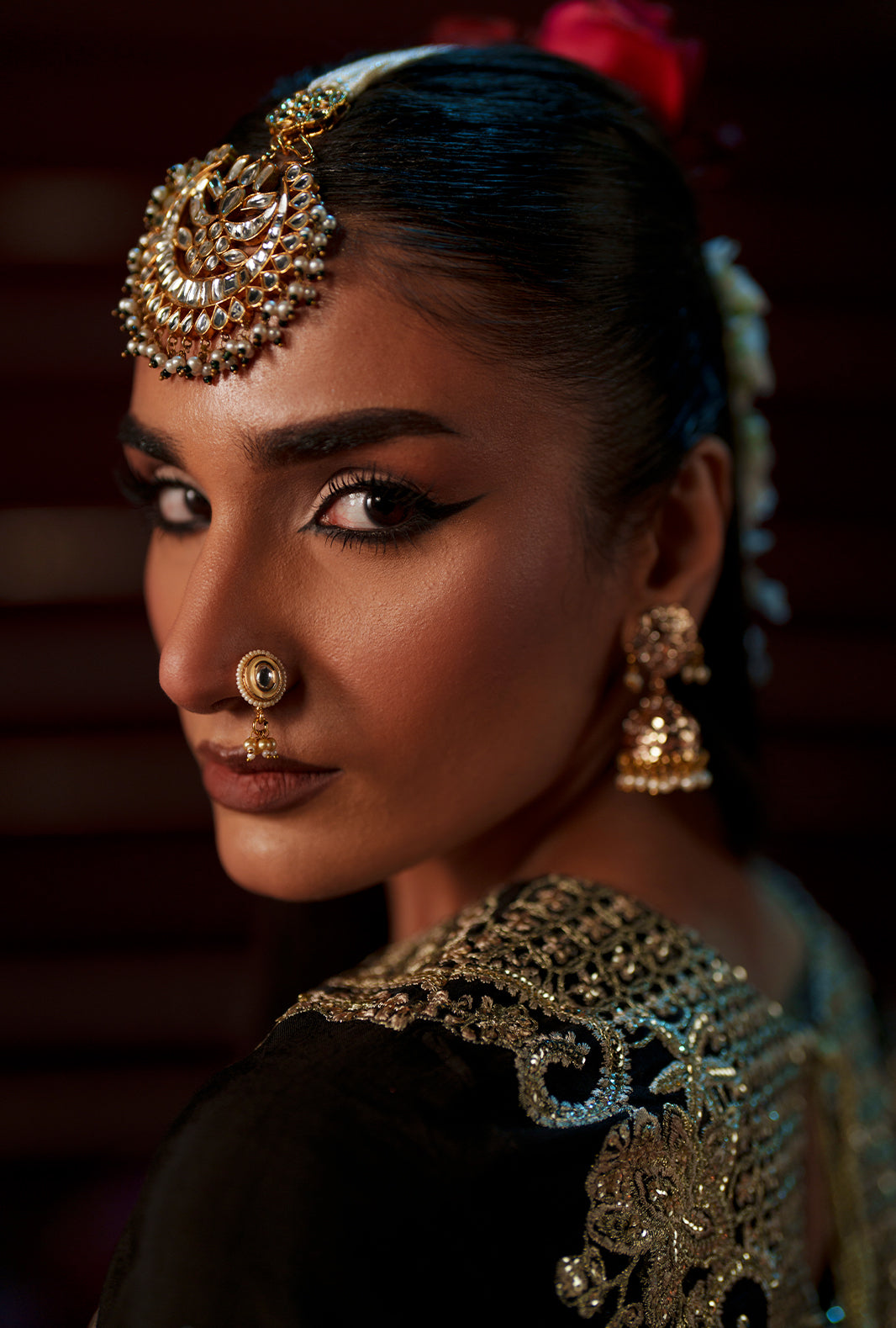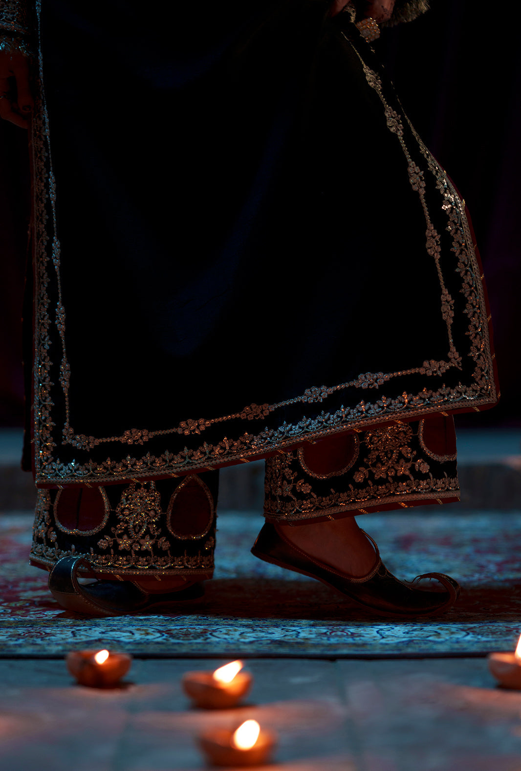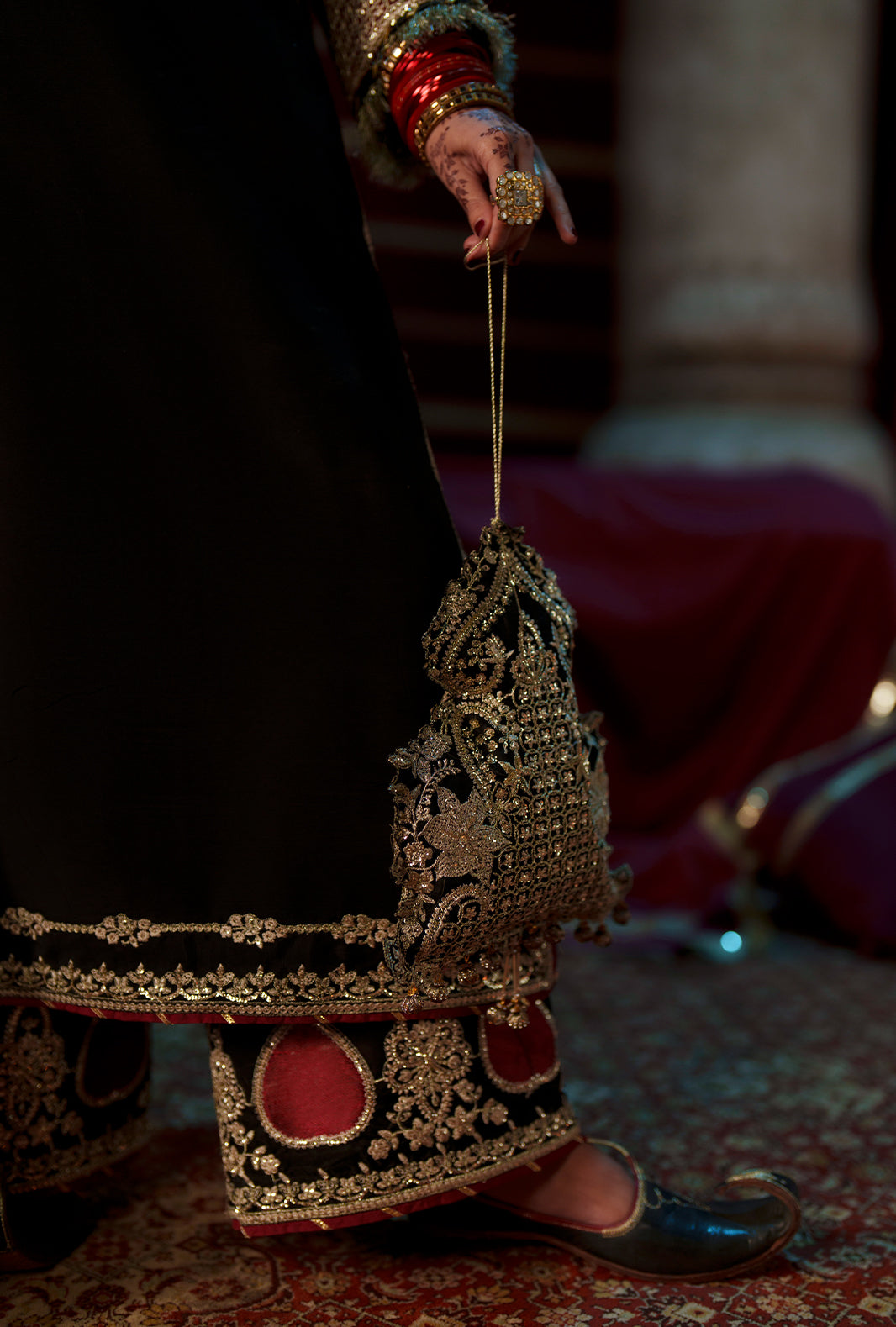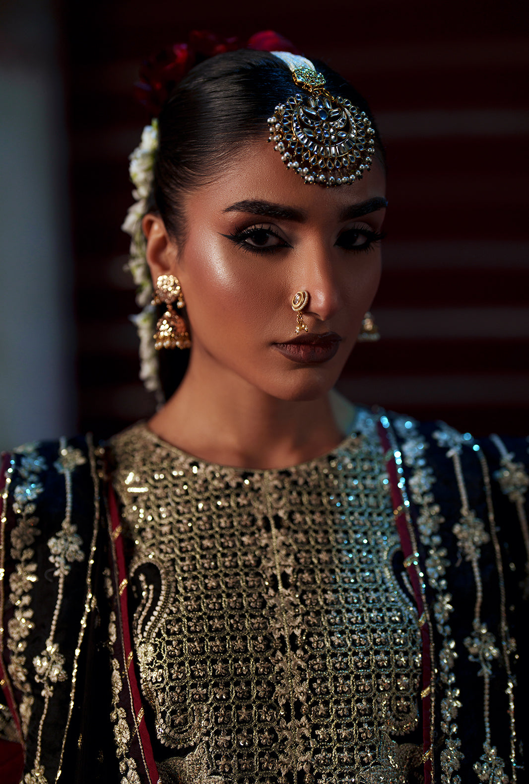 In black rawsilk, the kameez stands tall with a statement neckline, embroidered daman, and intricate sides. Maroon borders and floral-geometric motifs trace the sleeves, while the appliqued trouser echoes its charm. Draped with a chiffon dupatta kissed by sequins, its maroon pallu and embroidered edges sway like poetry in motion, turning every moment into a celebration of artistry and timeless beauty.
