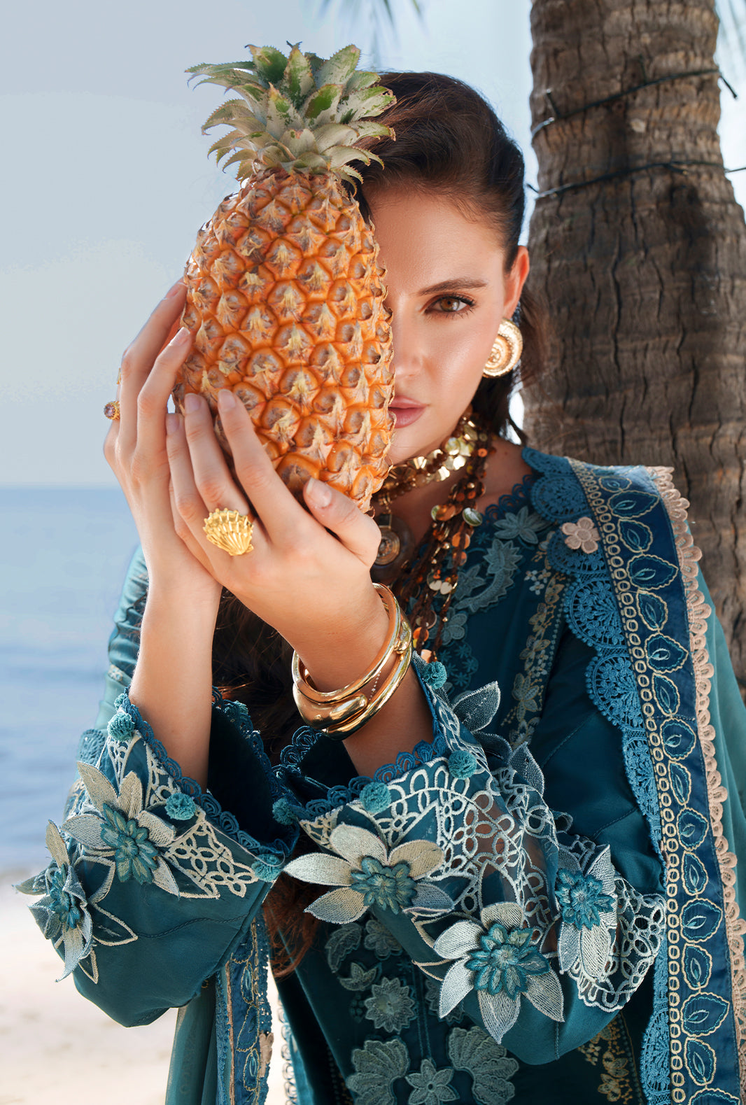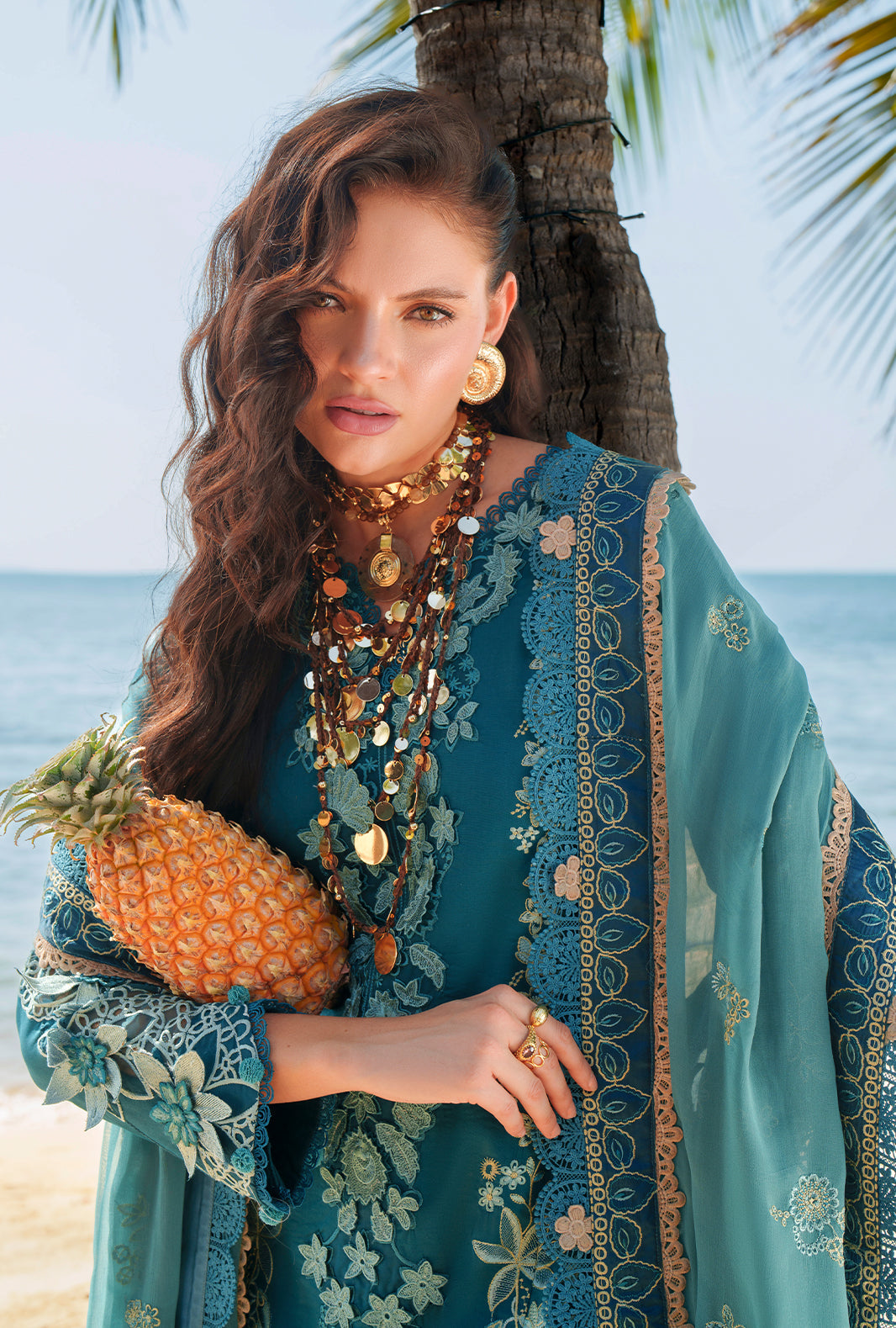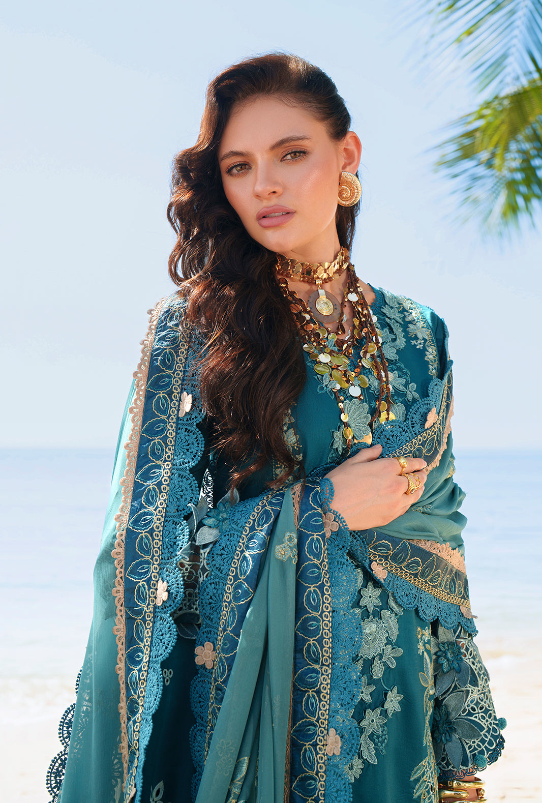 A statement chikankari embroidered lawn ensemble elevated with layered shmose silk borders and a delicate organza neckline.
