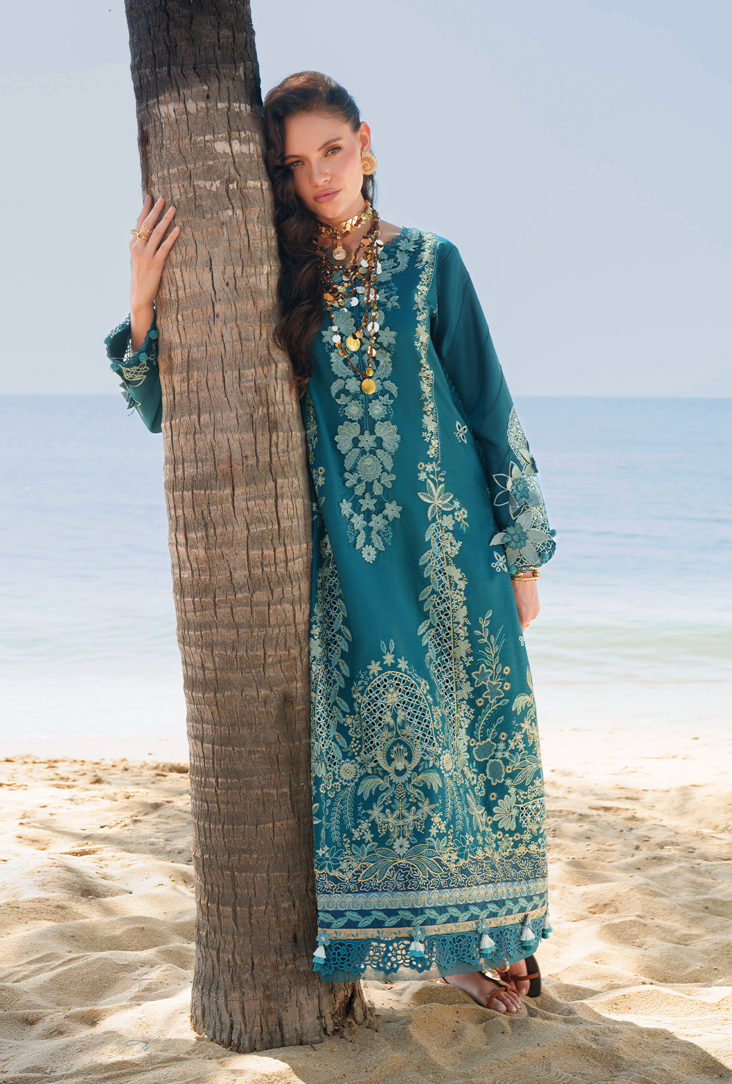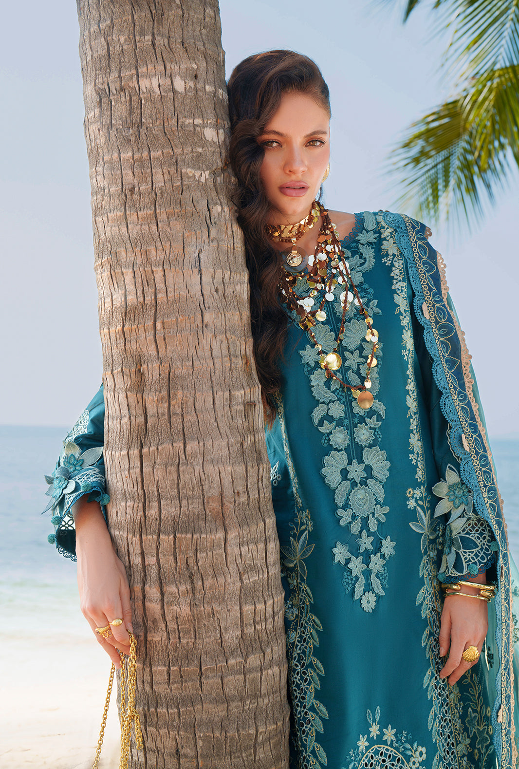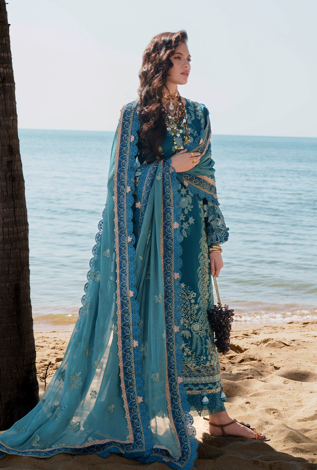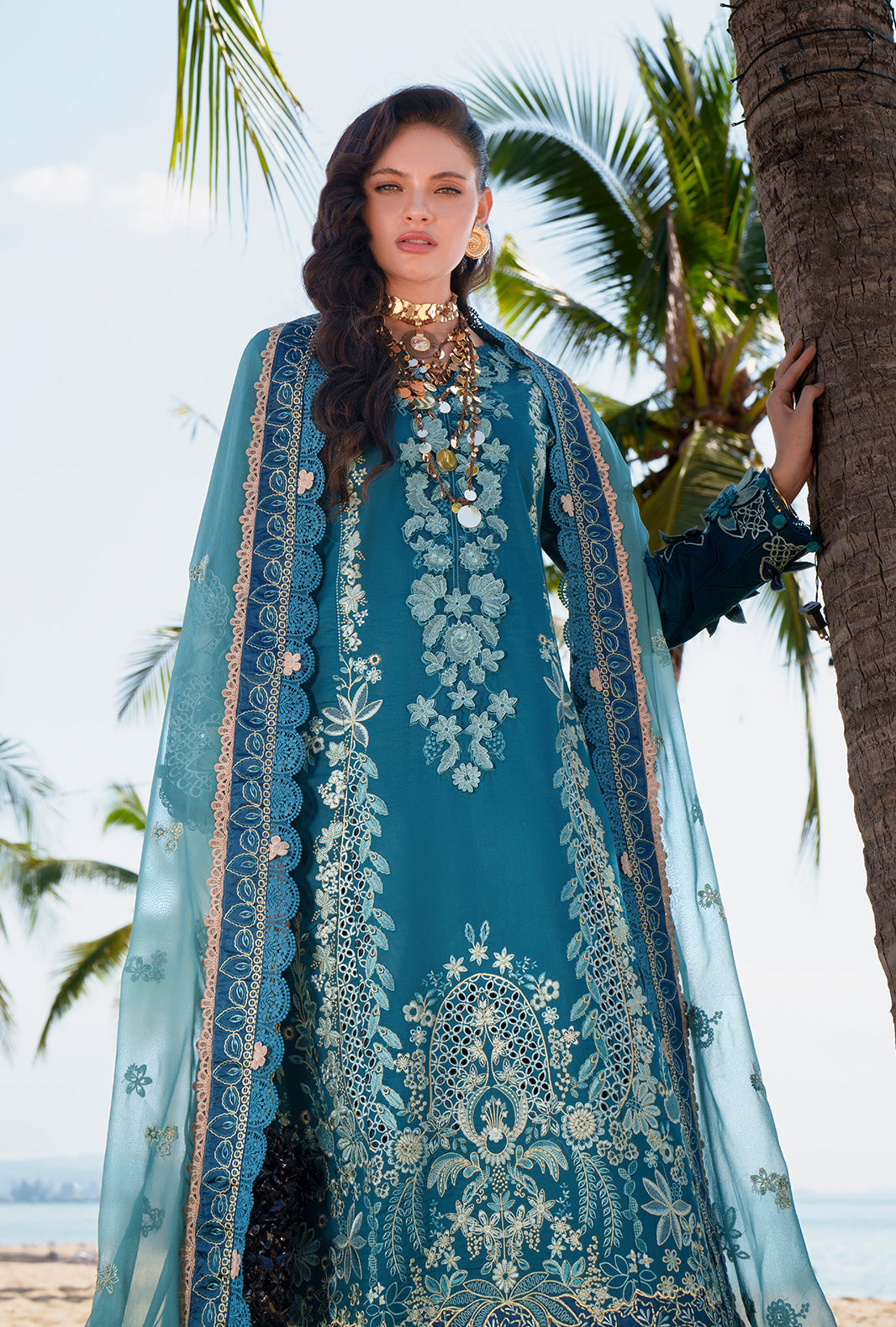 Finished with 3D floral sleeve accents, an intricately embroidered chiffon dupatta, and cambric trousers, this look exudes contemporary elegance and timeless charm.