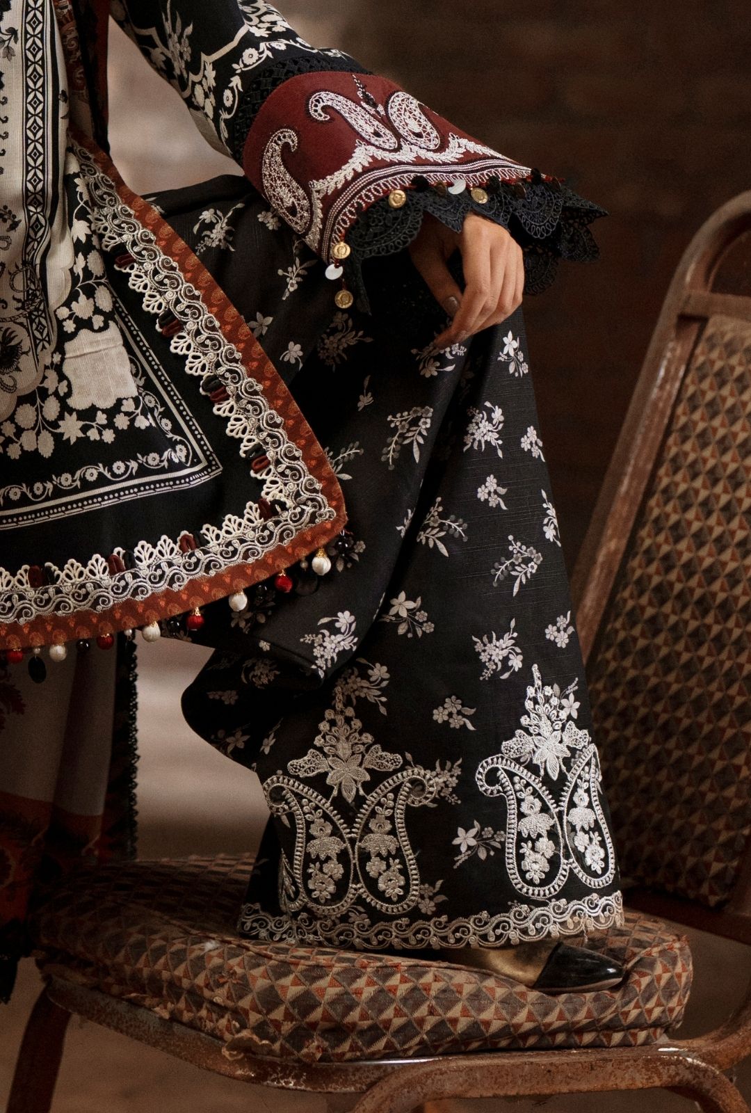 An ivory khaddar fabric shirt adorned with black printed elements, paired with black sleeves detailed in ivory prints - a perfect balance of grace and contrast. A floral mix with paisleys, touched with deep maroon printed accents, adds a layer of luxury. The look is elevated with embroidered neckline, maroon silk sleeve borders, and delicate embroidered lace on shirt sides. A printed khaddar trouser with an embroidered border completes the set, while the statement herringbone shawl - featuring paisley accents on ivory - wraps it all together in warmth and charm.
