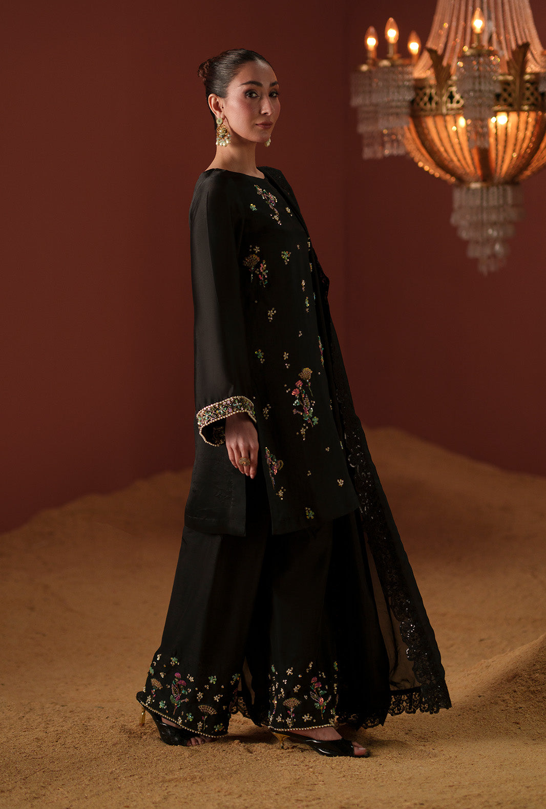 A silk embroidered dupatta completes the outfit with a sophisticated, feminine touch.