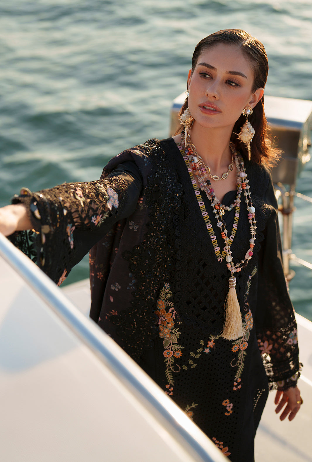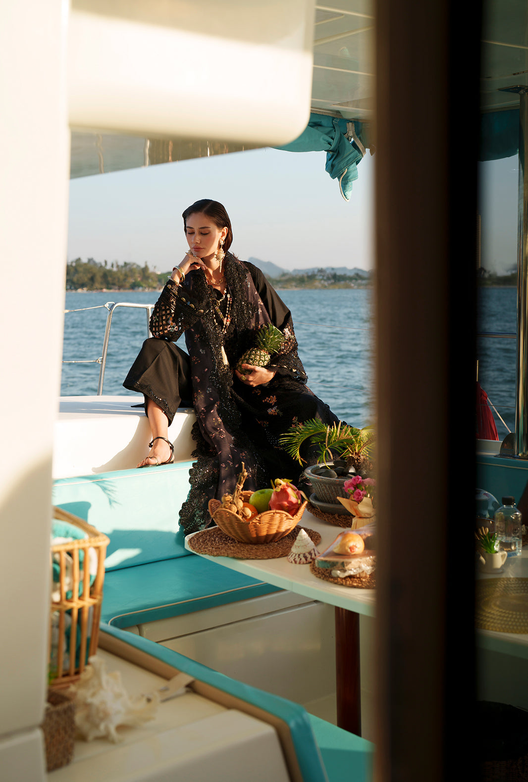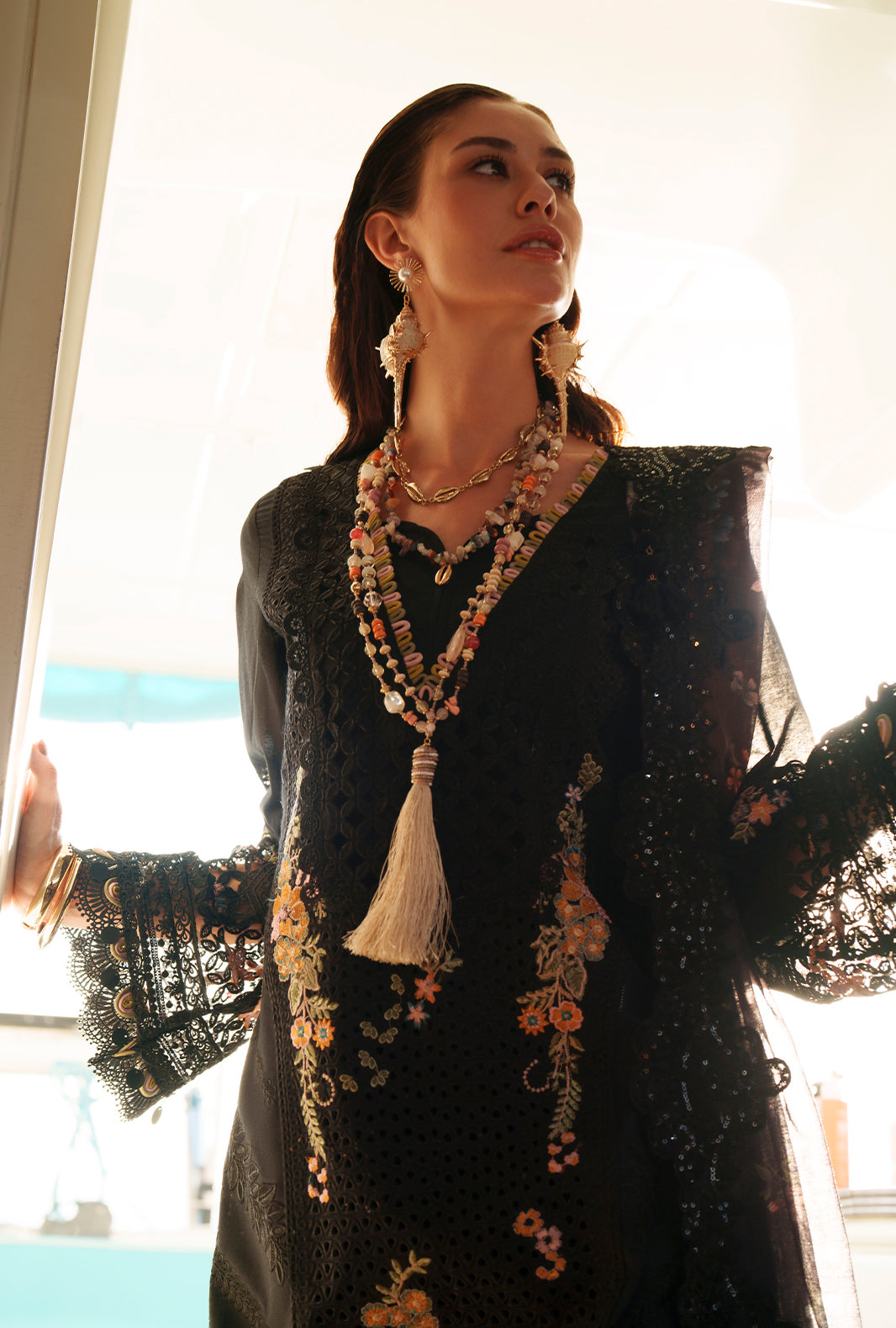 A graceful chikankari embroidered lawn ensemble enhanced with delicate organza detailing on the neckline and borders for refined elegance.