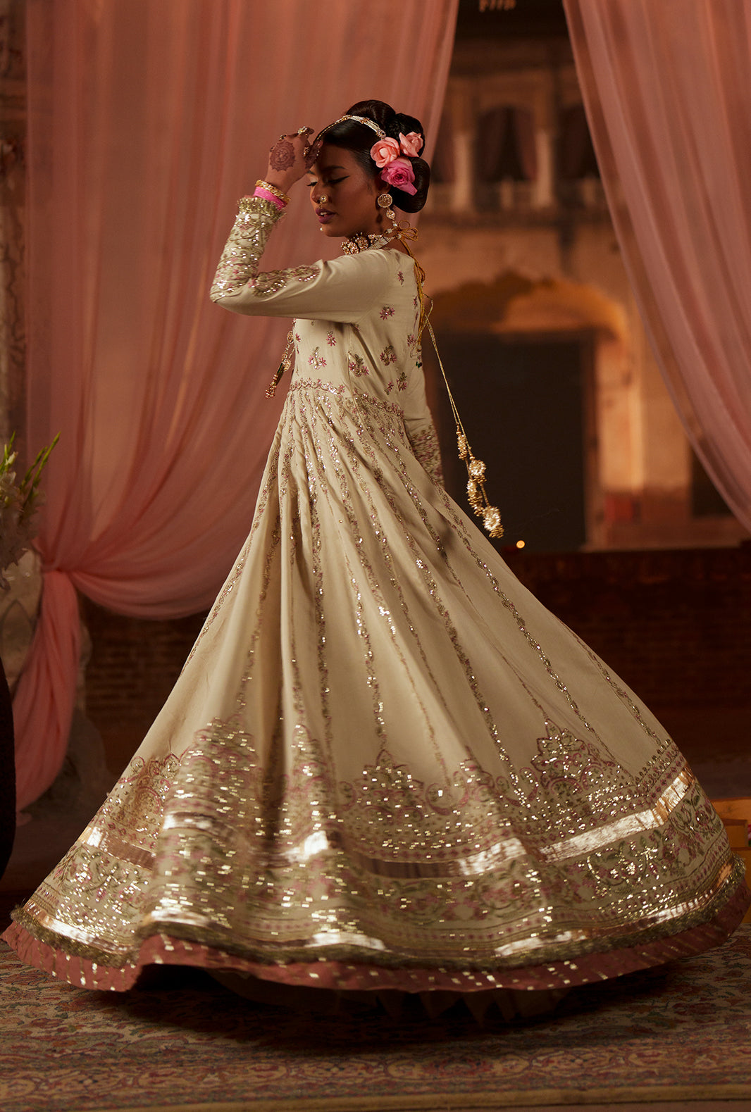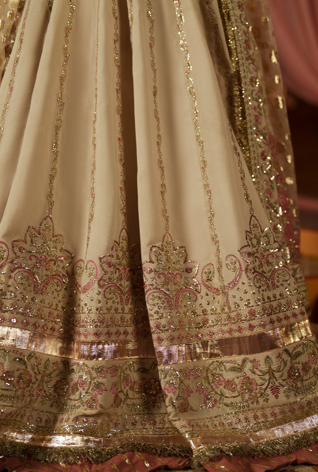 An off-white rawsilk kalidar pishwas adorned with embroidered front and back yokes in tilla, sequins, and resham threads in teapink and mint. Twelve intricately embroidered panels bring depth to the front and back, finished with ornate flare borders. A zari organza dupatta, with a teapink embroidered pallu and off-white silk-bordered edges, completes a look that resonates with celebration, elegance, and timeless craftsmanship.