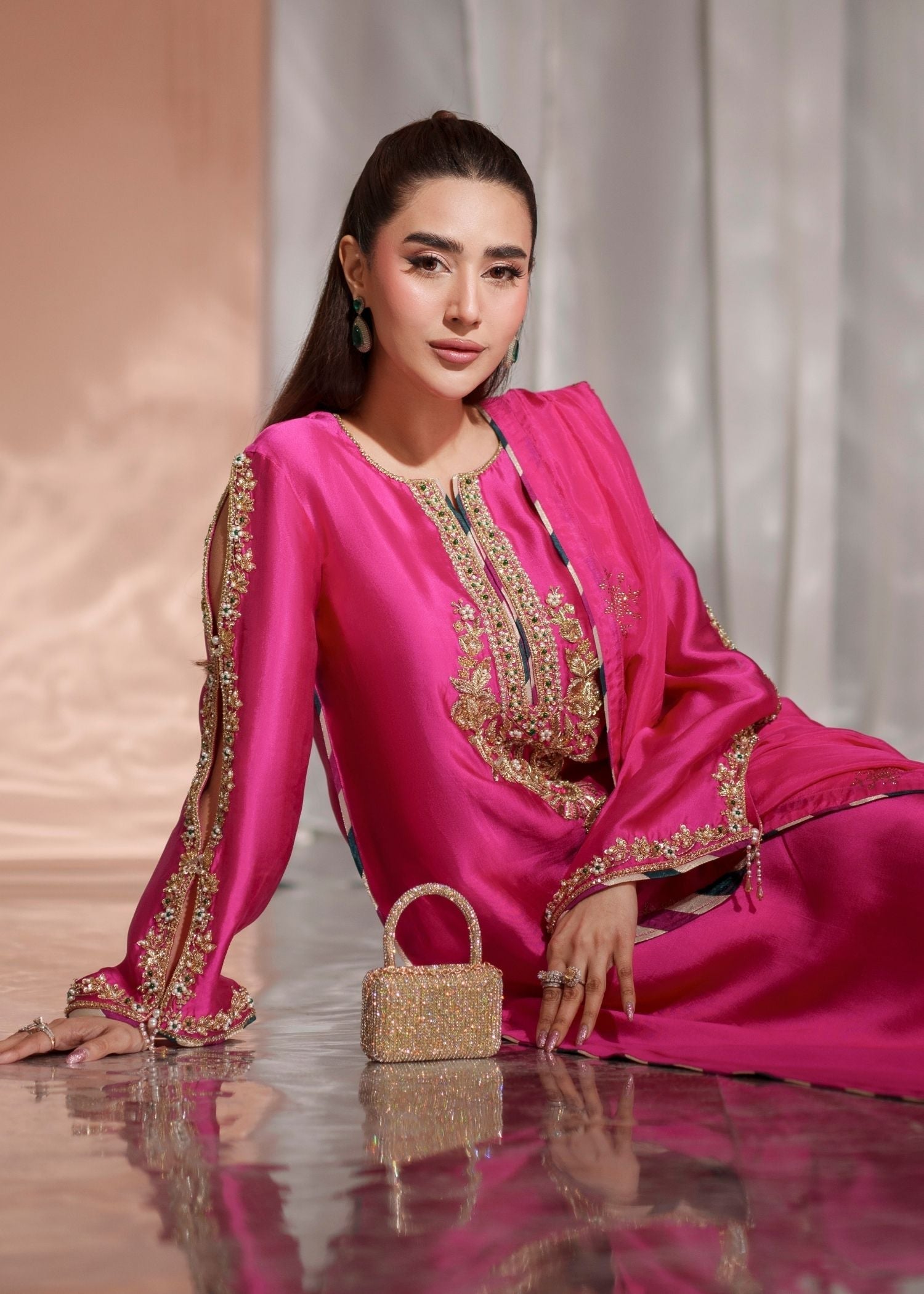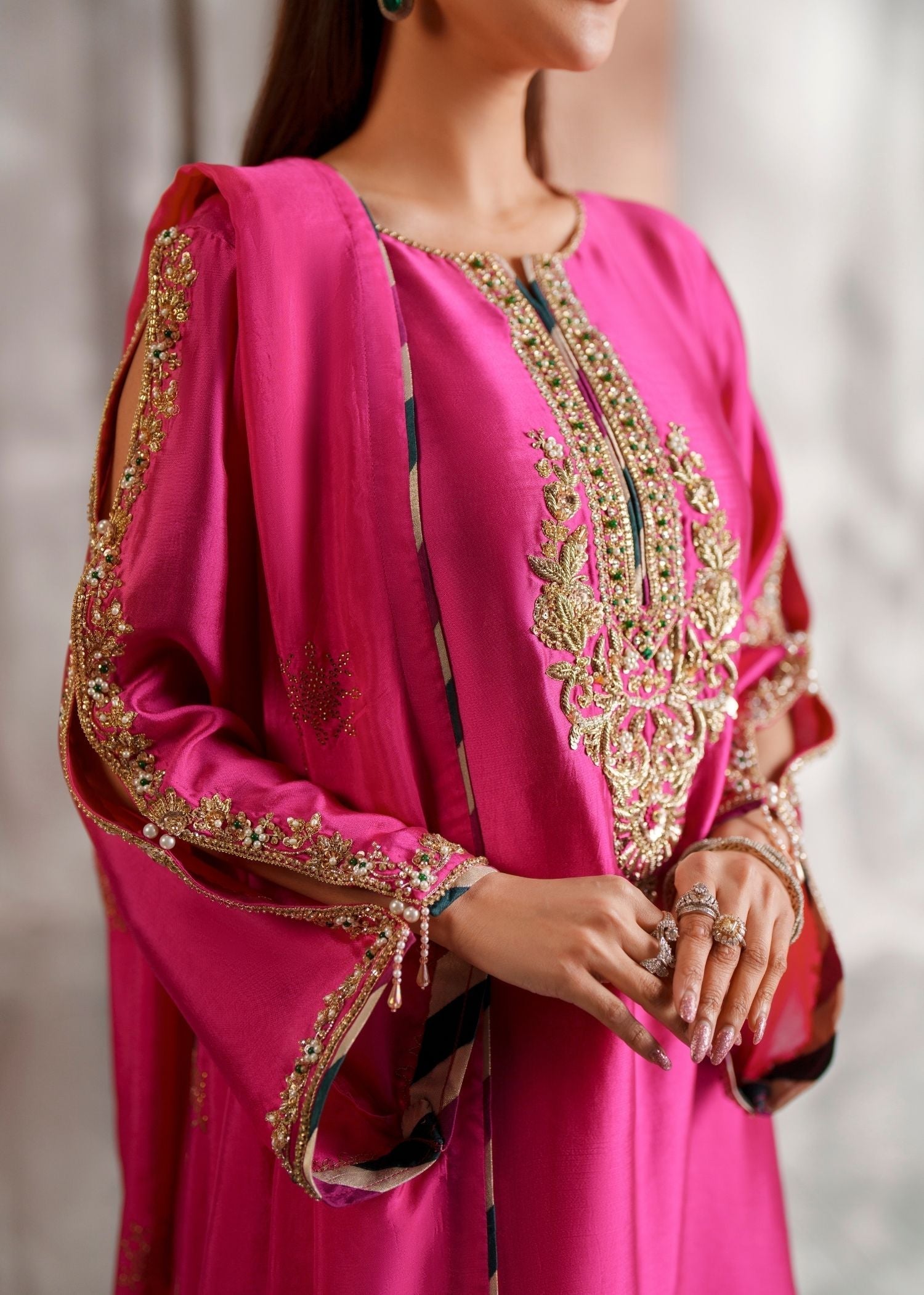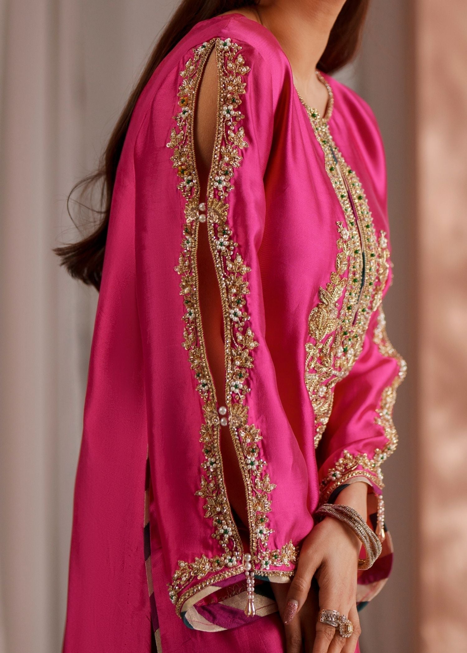 Livia is crafted in pure Shesha silk, showcasing a long shirt in deep fuchsia. Styled with a raw silk trouser and a silk dupatta, it is adorned with rich, intricate handwork.