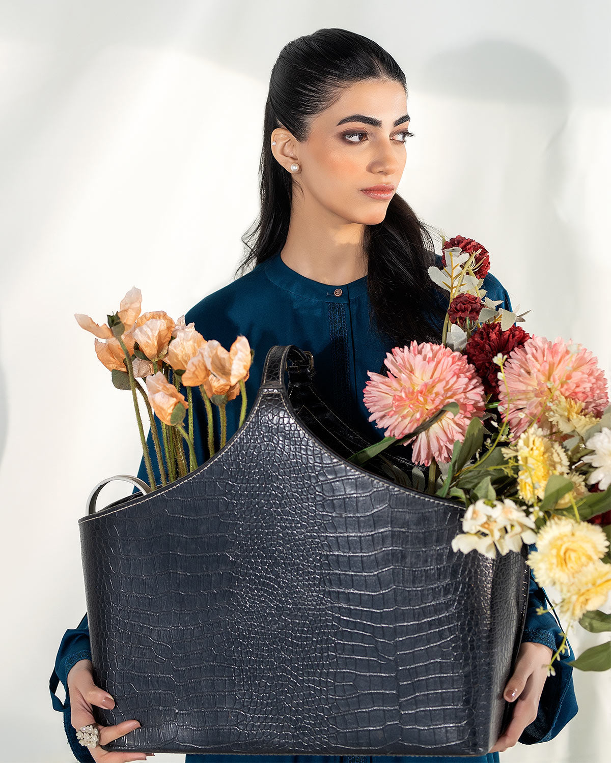 A rich teal-green flowing outfit embodies grace and effortless charm, perfect for both casual and formal occasions. The outfit could feature a maxi dress or a long tunic with an airy, lightweight fabric like tuile, draping beautifully to create fluid movement with every step. The rich teal-green hue enhances the outfit's elegance, offering a striking yet soft visual appeal.Pair it with strappy sandals or heels for a polished look, and accessorize with minimal jewelry, such as gold earrings or a pendant necklace, to let the vibrant color take center stage. This outfit is ideal for garden parties, evening dinners, or any event where comfort meets style.