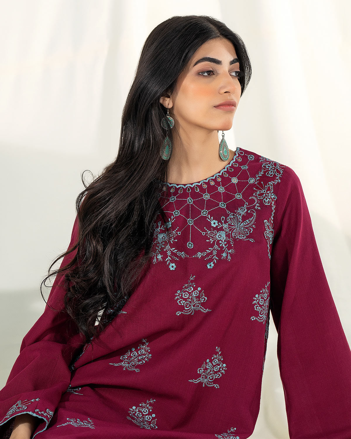 A striking hot pink khaddar shalwar kameez that combines boldness with subtle elegance. The vibrant hot pink hue is eye-catching and lively, while the soft khaddar fabric ensures warmth and comfort. Delicate light blue embroidery adorns the neckline and sleeves offering a beautiful contrast that softens the brightness of the pink. The embroidery adds a feminine touch, making the ensemble perfect for festive or semi-formal occasions.