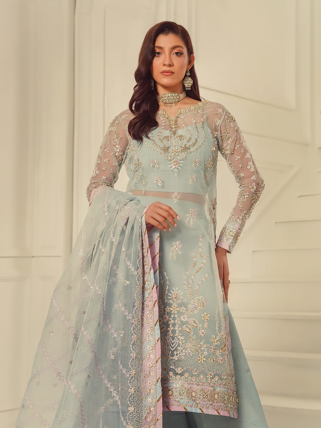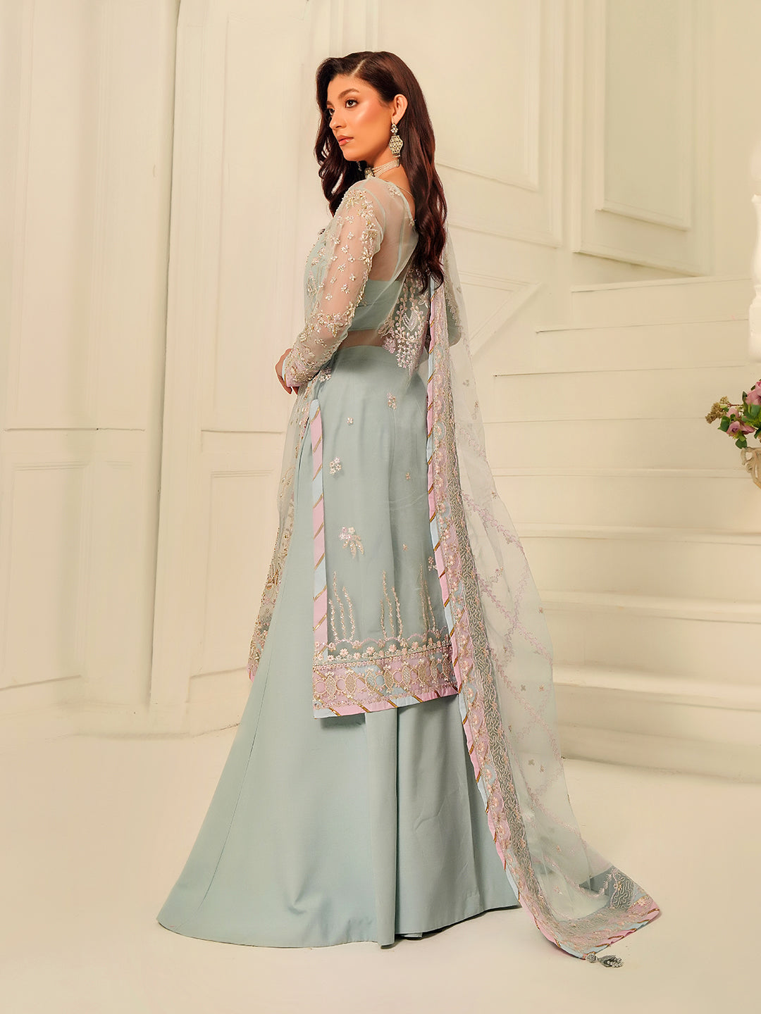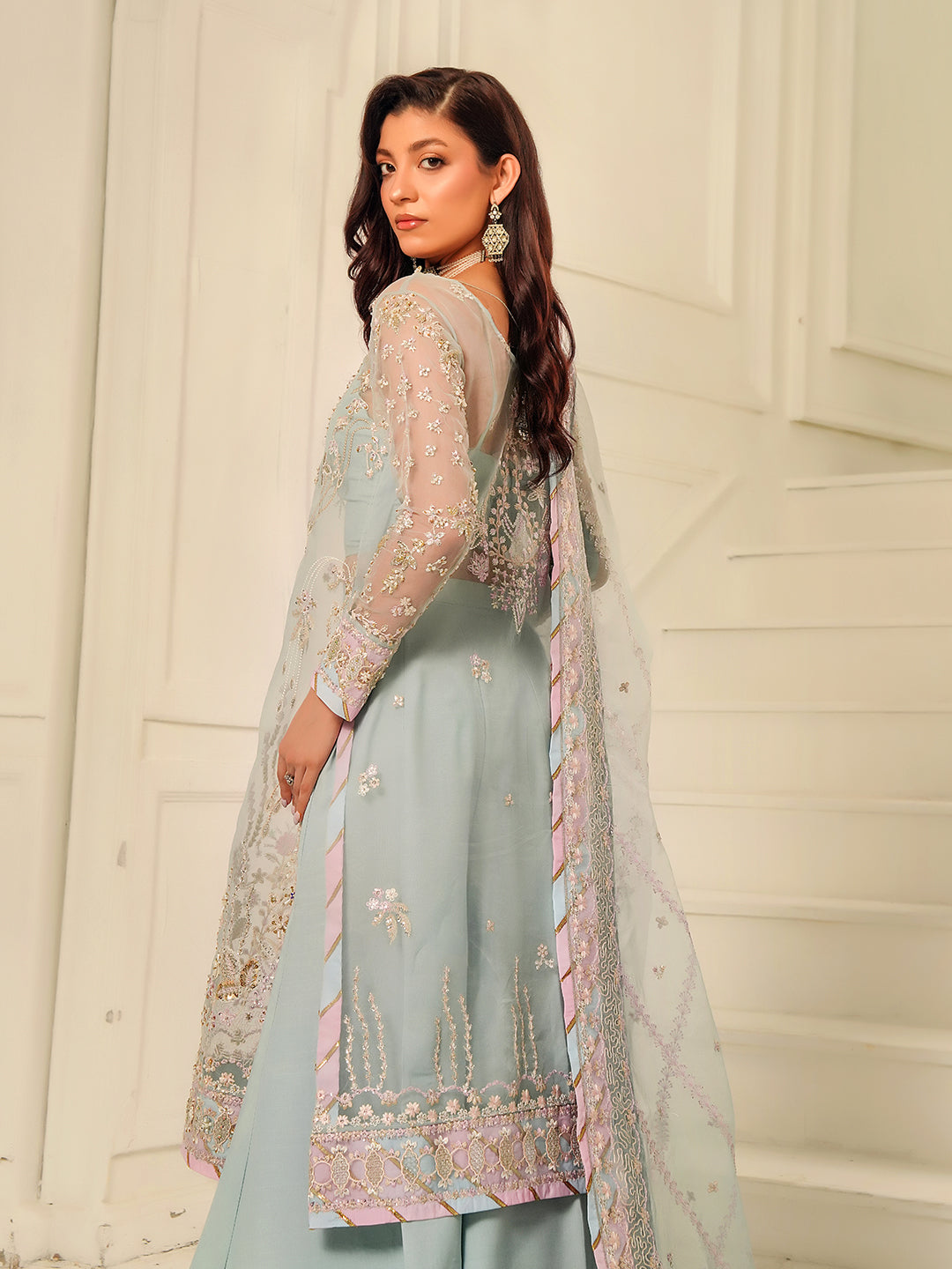 This aqua ensemble is beautifully adorned with delicate golden embellishments that add a regal touch to its fresh hue. The shirt features a daman finished with striking contrast chatta patti detailing, giving it a festive and vibrant edge. Paired with a matching aqua dupatta, enhanced with a finely crafted chatta patti border, and completed with plain pants. A truly unique piece, it captures the spirit of celebration with effortless grace.