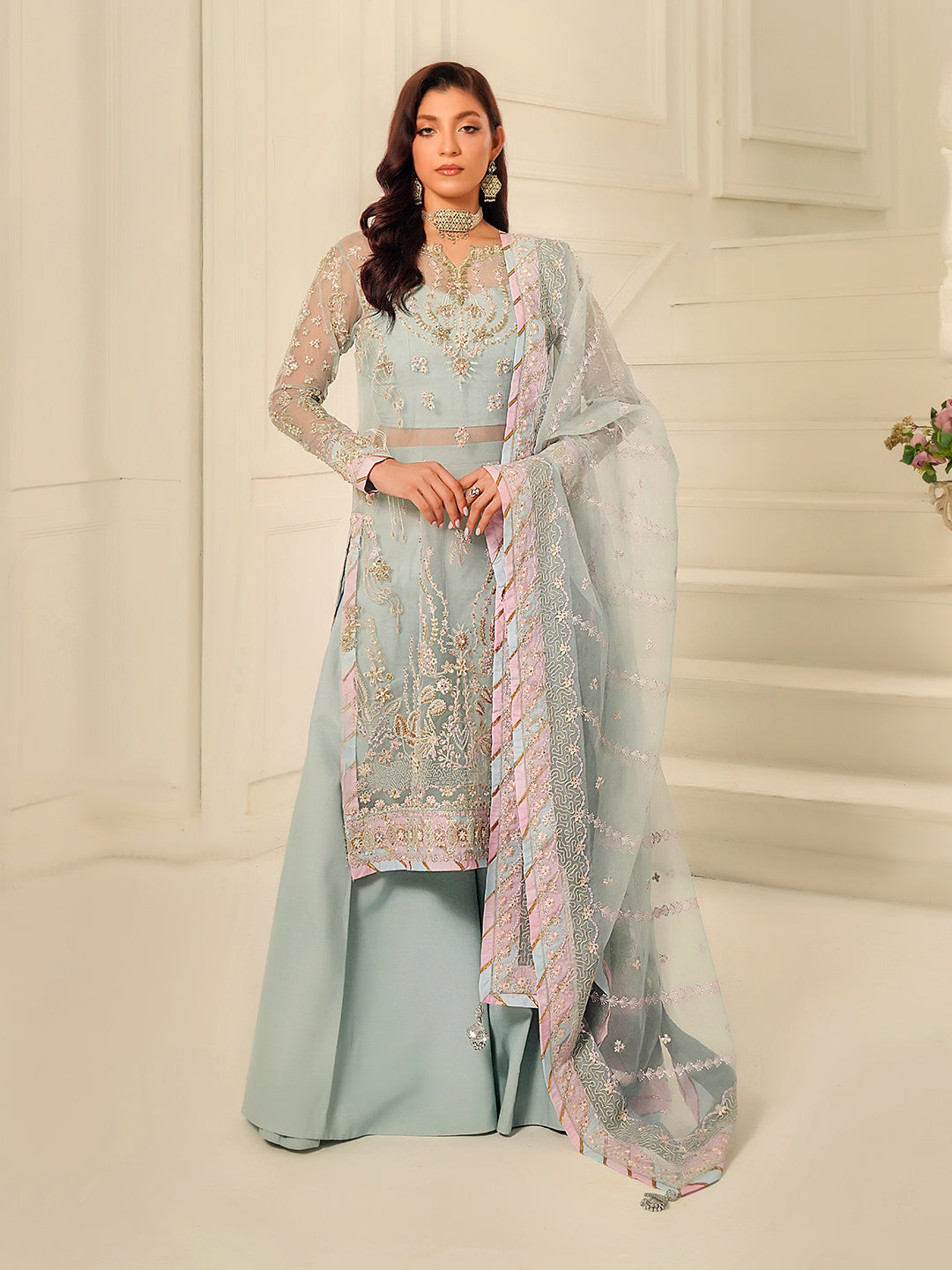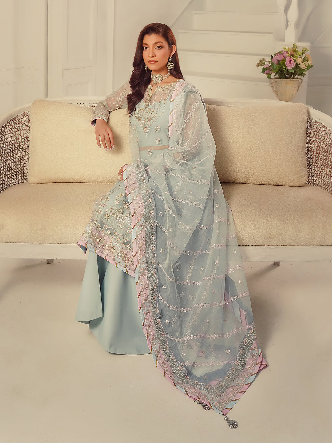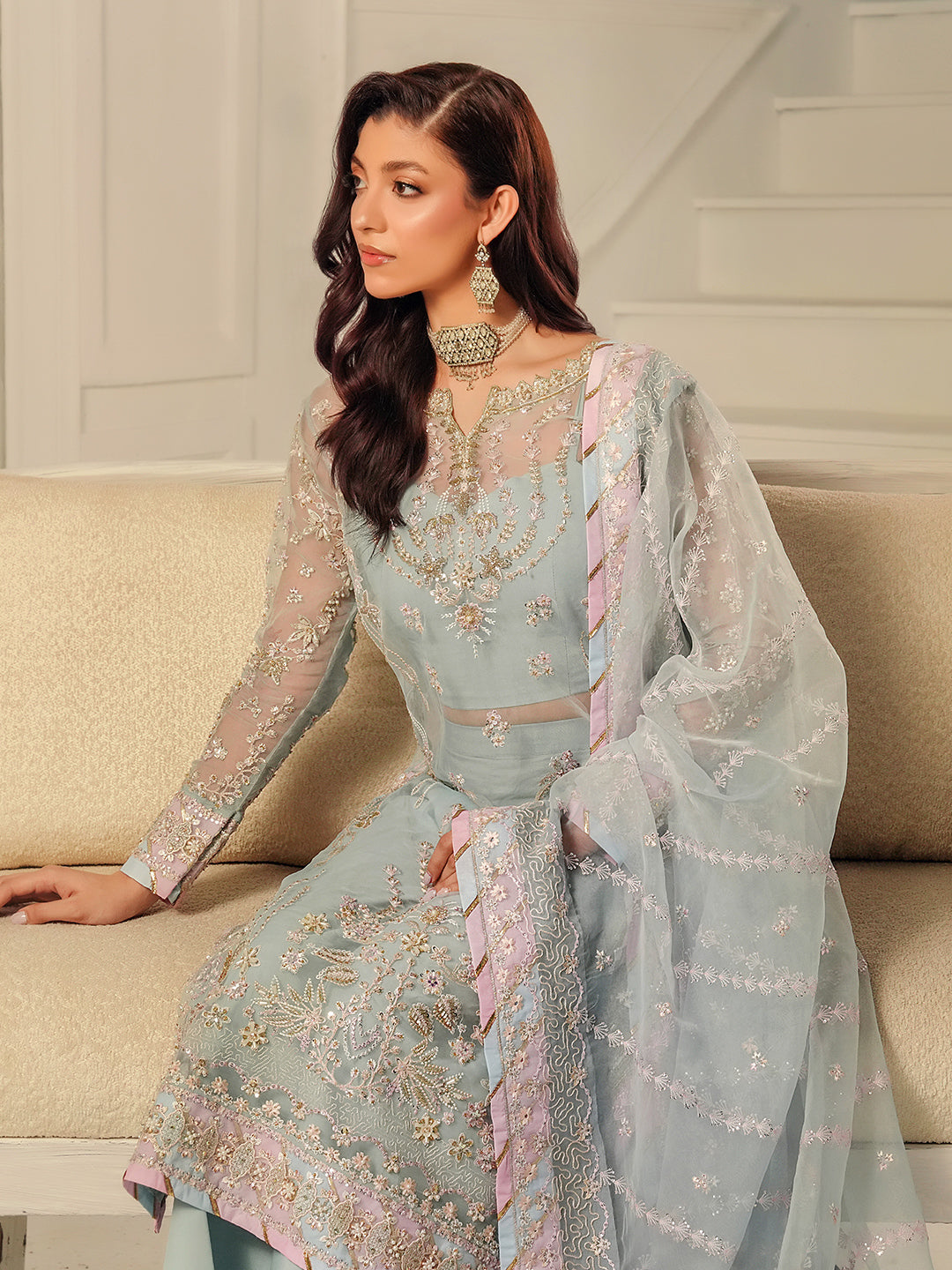 This aqua ensemble is beautifully adorned with delicate golden embellishments that add a regal touch to its fresh hue. The shirt features a daman finished with striking contrast chatta patti detailing, giving it a festive and vibrant edge. Paired with a matching aqua dupatta, enhanced with a finely crafted chatta patti border, and completed with plain pants. A truly unique piece, it captures the spirit of celebration with effortless grace.