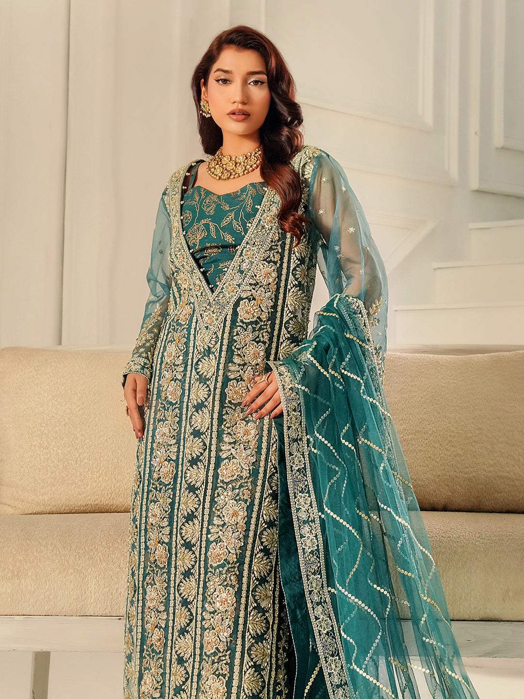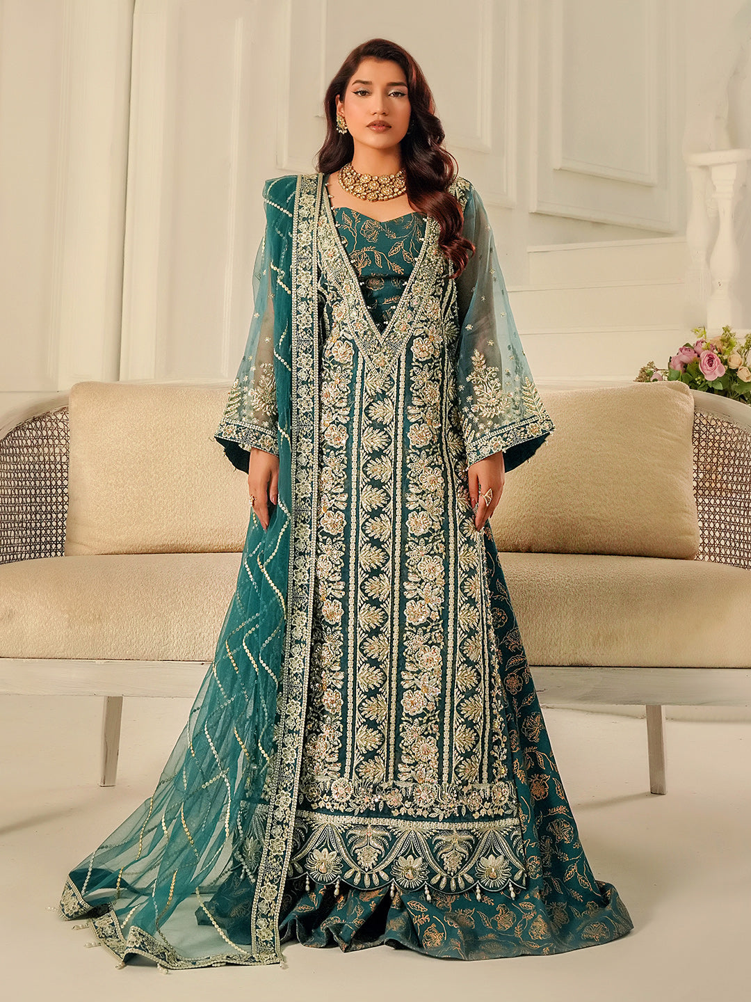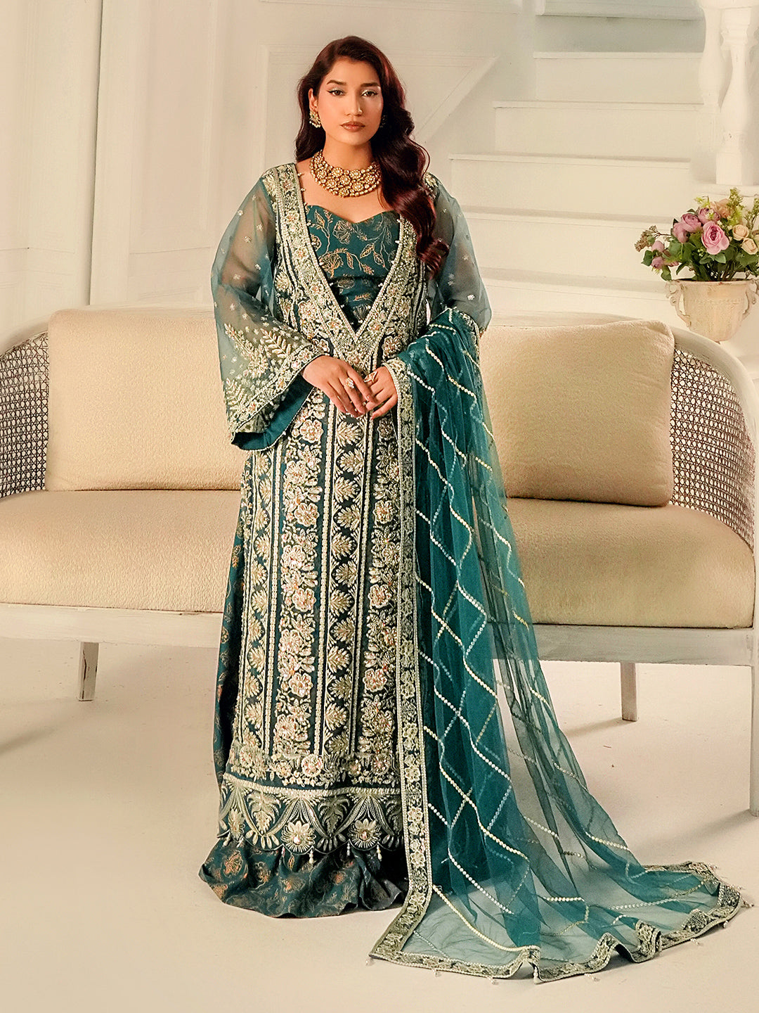 An Experimental festive must-have, this long shirt features a striking deep V-neckline with printed inner and a fully embellished floral 3D pattern that radiates luxury. The intricate detailing brings a contemporary flair while keeping its traditional essence alive. Paired with a minimal embroidery dupatta and chic Floral Printed Flaired Lower, this look is designed to make a bold yet elegant statement for festive.