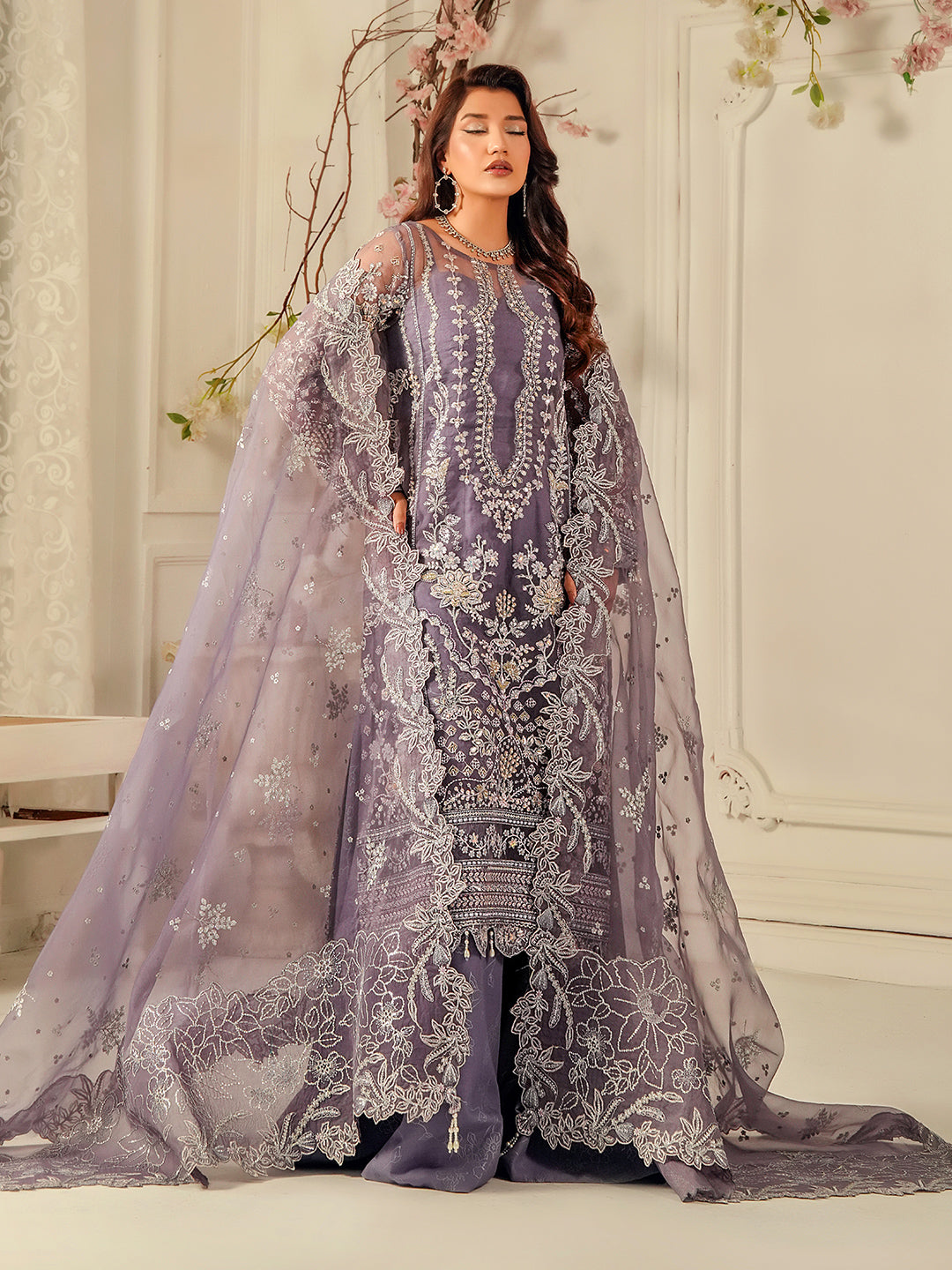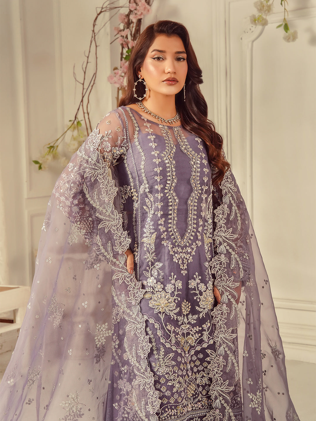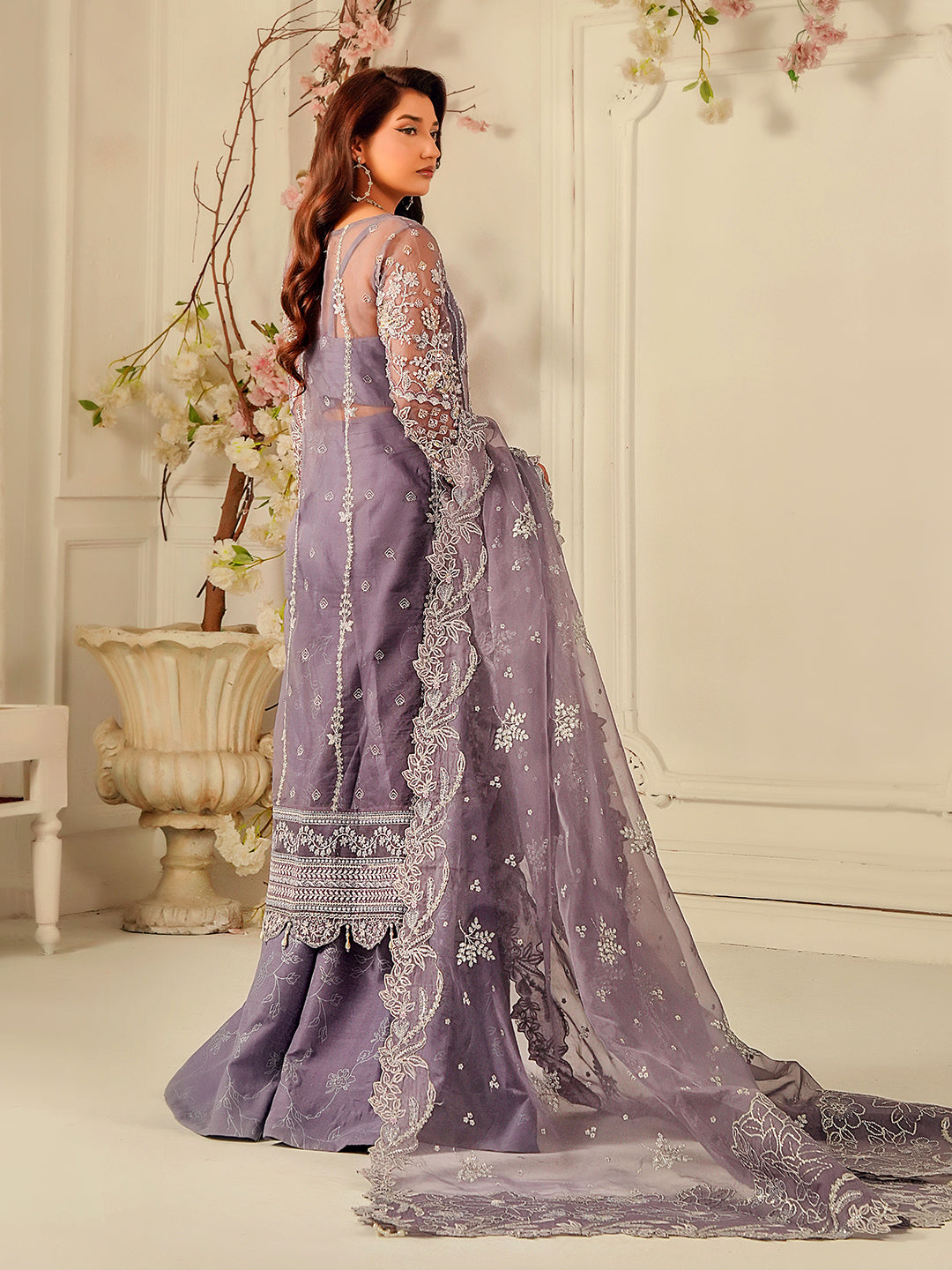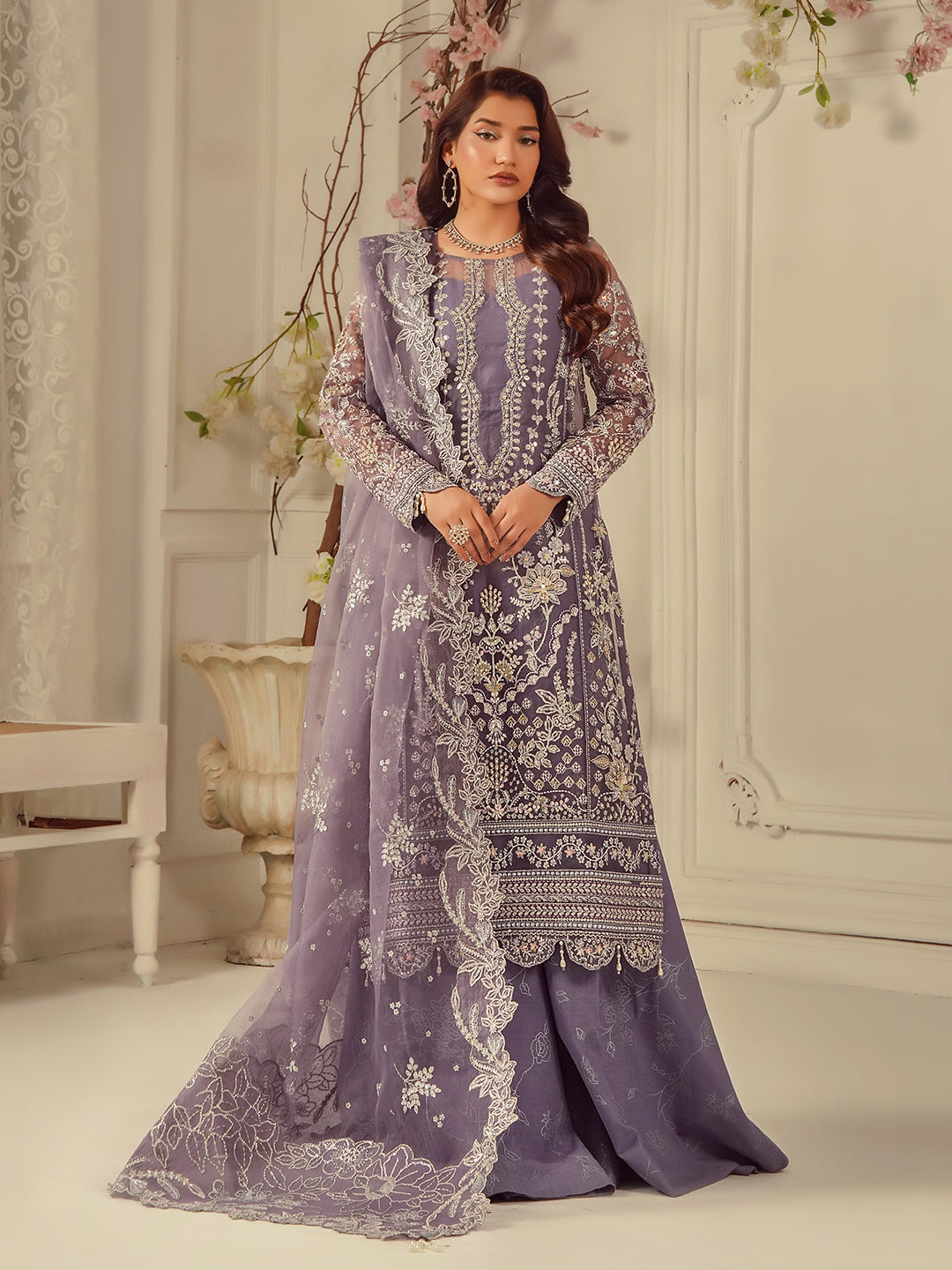 Sumbul – A graceful ensemble in a dreamy lavender tone, featuring a straight pannels shirt with a round neckline and delicate hand embellishments. Printed Plazo Pant and matching embroidered sequence dupatta with Pallu having scaloping on its edges merge subtle allure with everlasting grace.